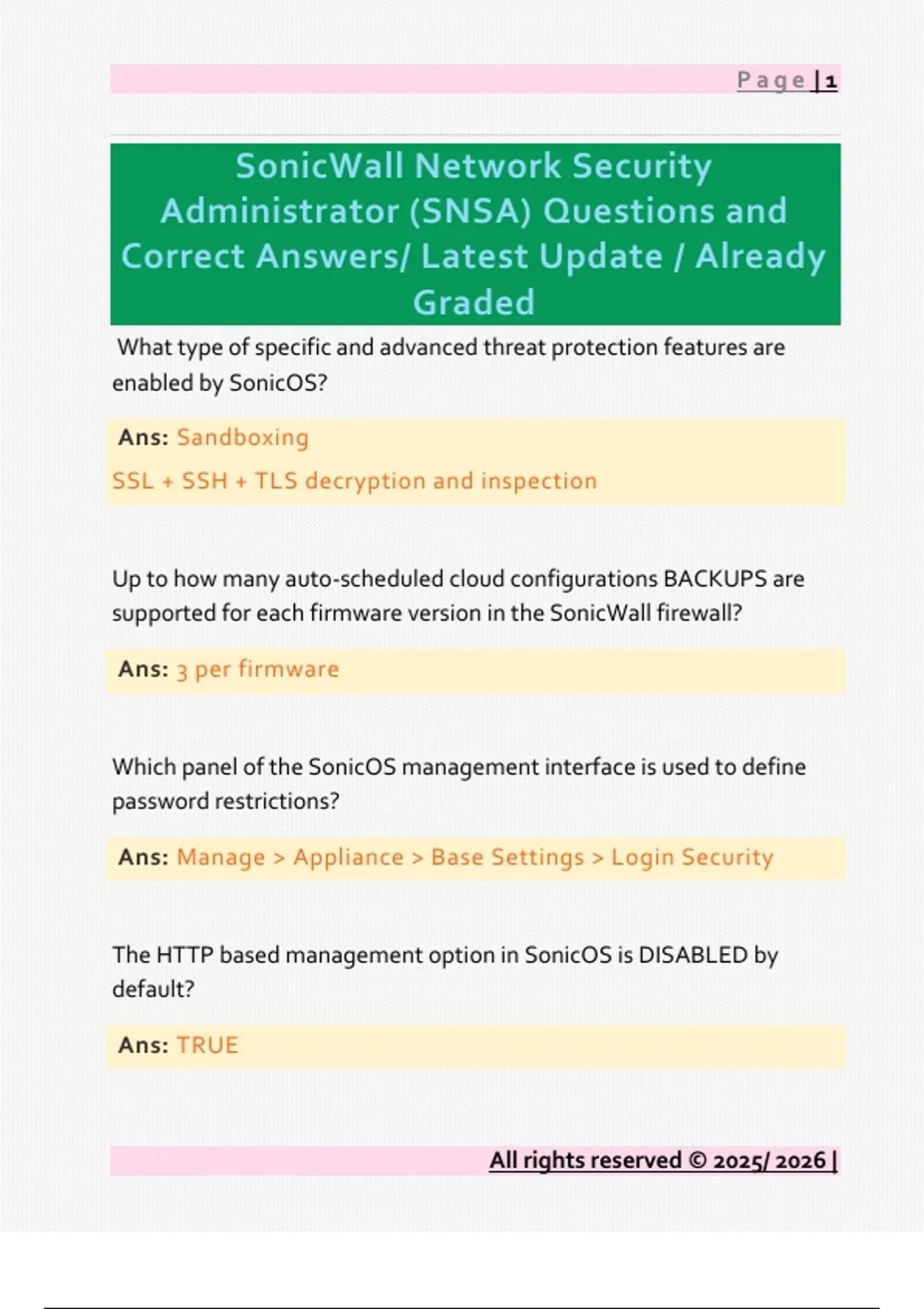 What type of specific and advanced threat protection features are enabled by SonicOS? Ans: Sandboxing SSL + SSH + TLS decryption and inspection Up to how many auto-scheduled cloud configurations BACKUPS are supported for each firmware version in the SonicWall firewall? Ans: 3 per firmware Which panel of the SonicOS management interface is used to define password restrictions? Ans: Manage > Appliance > Base Settings > Login Security The HTTP based management option in SonicOS is DISABLED by default? Ans: TRUE All rights reserved © 2025/ 2026 | Page | 2 SonicWall firewalls can inter operate whit any X509v3 certificates issued by 3rd party CA authorities? Ans: TRUE Which of the following is a built-in firewall system schedule? Ans: Work Hours Which setting when enabled requires a strong password setting to avoid potential security vulnerabilities? Ans: Allow HTTPS on this WAN interface Which of the following is the default public server type? [Web, FTP, Mail, Terminal Services Server] Ans: Web Server Which local network is selected by default in the firewall? Ans: Firewall Subnets Which of the following network applications are available by default in the App Rule Guide to create policies? All rights reserved © 2025/ 2026 | Page | 3 Ans: SMTP FTP File Server Web Access