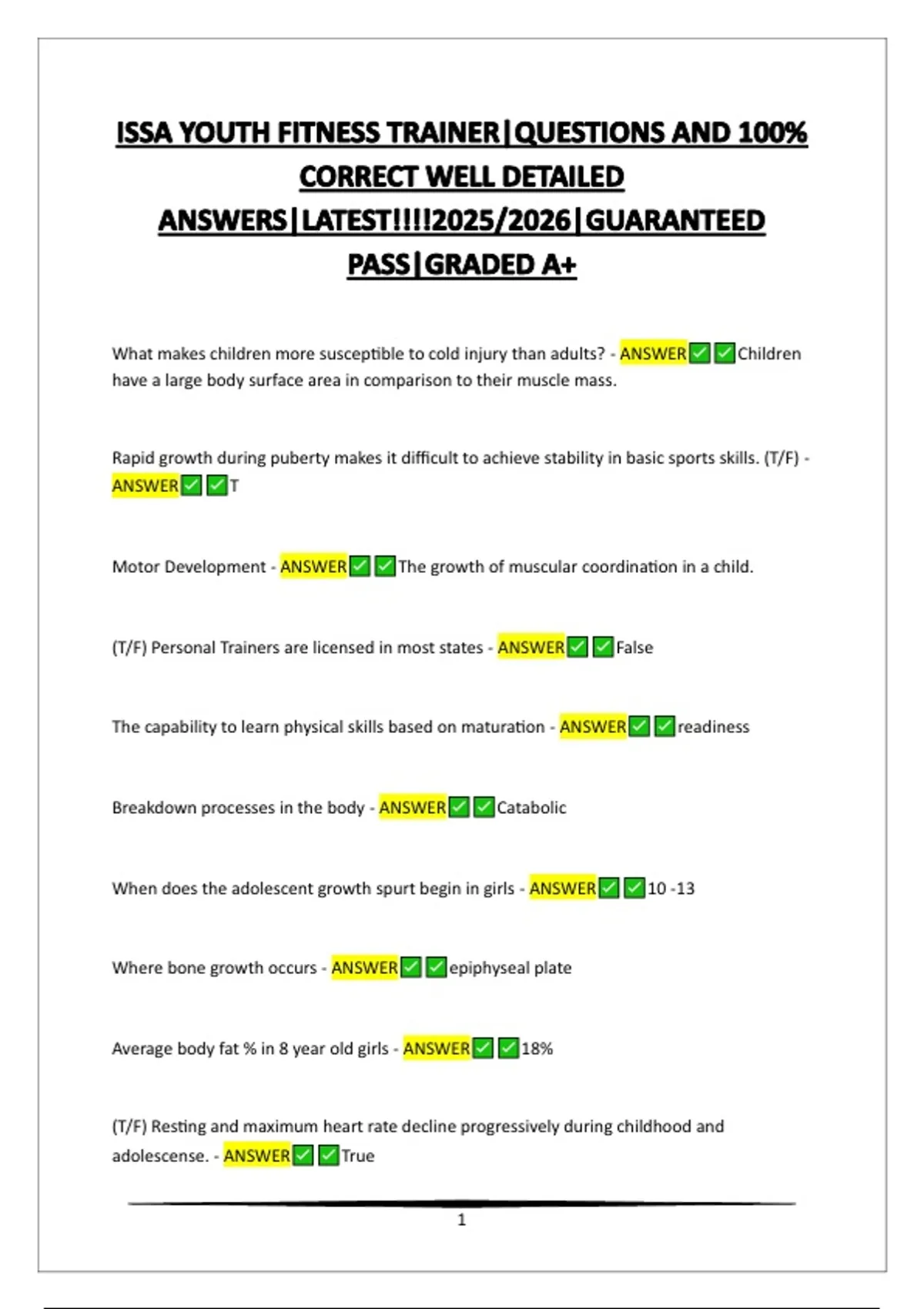 ISSA YOUTH FITNESS TRAINER|QUESTIONS AND 100% CORRECT WELL DETAILED ANSWERS|LATEST!!!!2025/2026|GUARANTEED PASS|GRADED A+