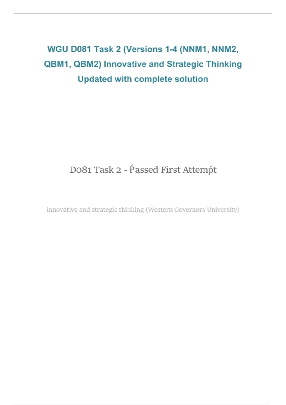 This document provides an updated and complete solution for WGU D081 Task 2 across Versions 1–4 (NNM1, NNM2, QBM1, QBM2) for the 2026/2027 academic year. It addresses all Task 2 requirements with clear, rubric-aligned responses, focusing on innovative and strategic thinking, problem analysis, evaluation of alternatives, decision justification, and implementation planning. The material is designed to support accurate submission and successful completion of the D081 assessment.