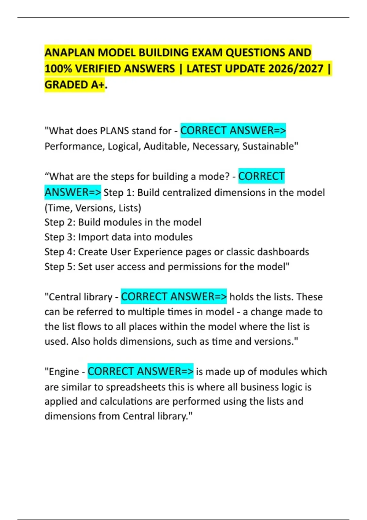 ANAPLAN MODEL BUILDING EXAM QUESTIONS AND 100% VERIFIED ANSWERS | LATEST UPDATE 2026/2027 | GRADED A+. "What does PLANS stand for - CORRECT ANSWER=> Performance, Logical, Auditable, Necessary, Sustainable" “What are the steps for building a mode? - CORRECT ANSWER=> Step 1: Build centralized dimensions in the model (Time, Versions, Lists) Step 2: Build modules in the model Step 3: Import data into modules Step 4: Create User Experience pages or classic dashboards Step 5: Set user access and permissions for the model" "Central library - CORRECT ANSWER=> holds the lists. These can be referred to multiple times in model - a change made to the list flows to all places within the model where the list is used. Also holds dimensions, such as time and versions." "Engine - CORRECT ANSWER=> is made up of modules which are similar to spreadsheets this is where all business logic is applied and calculations are performed using the lists and dimensions from Central library." "Types of modules that make up Engine - CORRECT ANSWER=> Input modules - provide the data used in calculations calculation modules - which include your business logic output modules - contain outcomes of calculation modules" "In a spreadsheet you enter formula in each cell, in anaplan you - CORRECT ANSWER=> enter the formula once in a line item - that line item respects every cell intersection with every dimension that it comes in contact with." "As opposed to spreadsheet, which is cell based, Anaplan is - CORRECT ANSWER=> Line item based within the context of different dimensions." "Following recommended best practices for list naming conventions, what is the name of the list you added to the model? - CORRECT ANSWER=> P3 SKU"