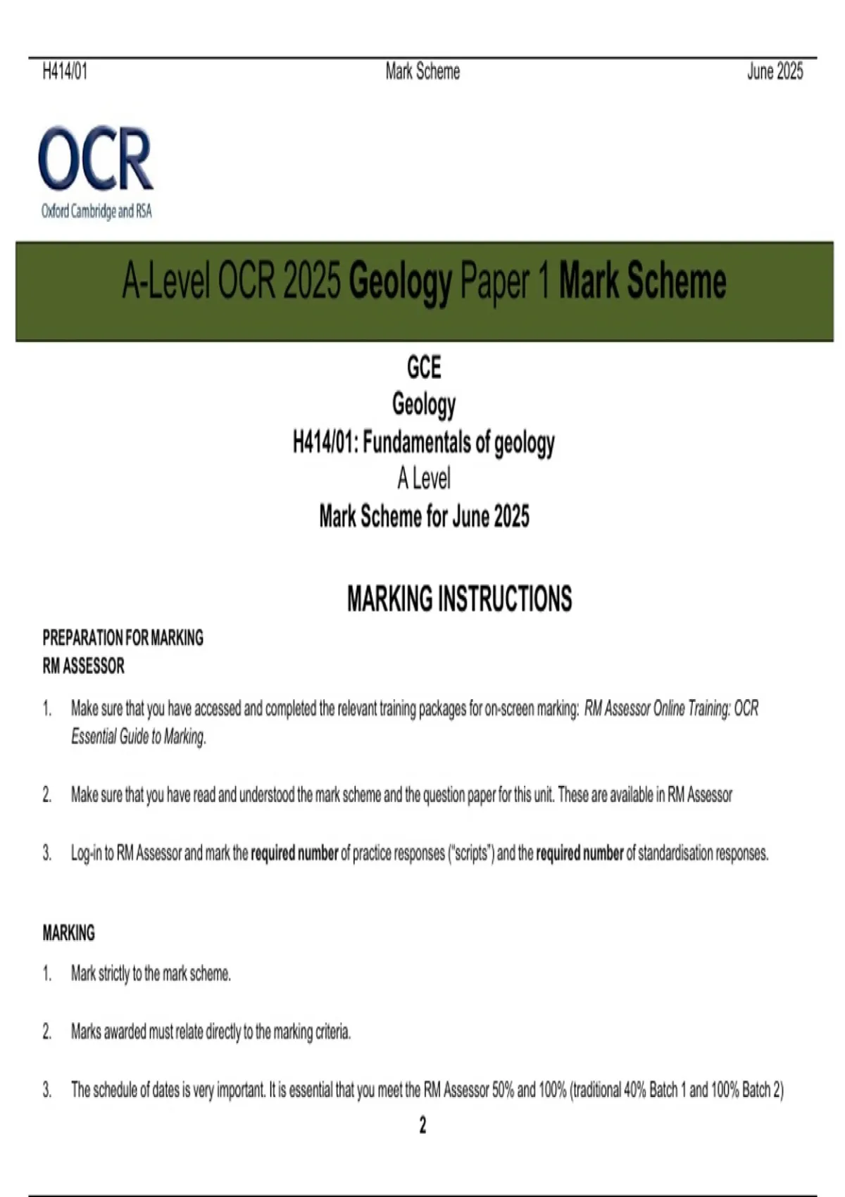 A-Level OCR 2025 Geology Paper 1 Mark Scheme