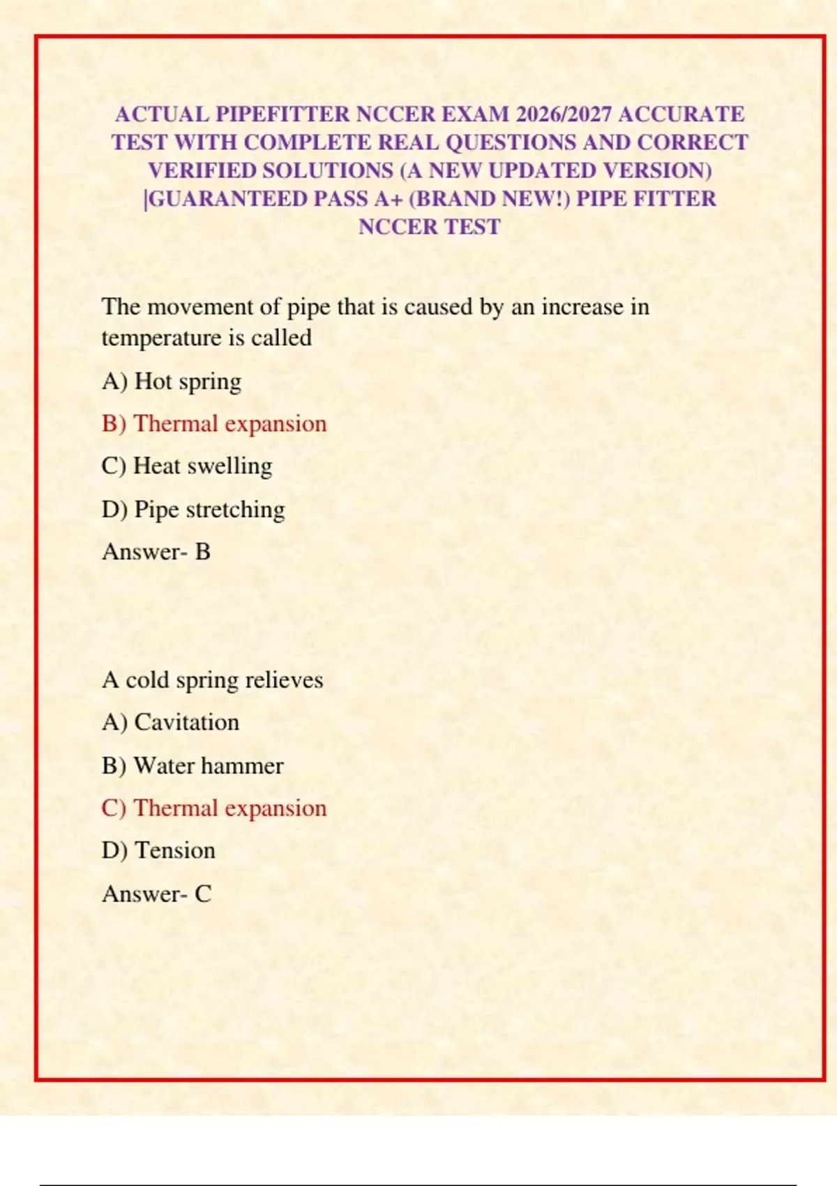 ACTUAL PIPEFITTER NCCER EXAM 2026/2027 ACCURATE TEST WITH COMPLETE REAL QUESTIONS AND CORRECT VERIFIED SOLUTIONS (A NEW UPDATED VERSION) |GUARANTEED PASS A+ (BRAND NEW!) PIPE FITTER NCCER TEST
