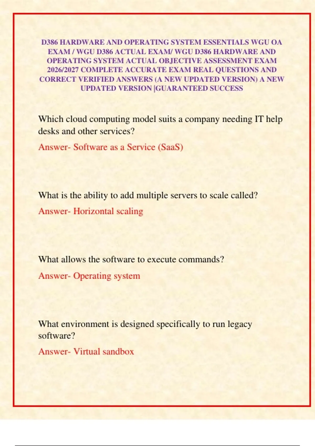D386 HARDWARE AND OPERATING SYSTEM ESSENTIALS WGU OA EXAM / WGU D386 ACTUAL EXAM/ WGU D386 HARDWARE AND OPERATING SYSTEM ACTUAL OBJECTIVE ASSESSMENT EXAM 2026/2027 COMPLETE ACCURATE EXAM REAL QUESTIONS AND CORRECT VERIFIED ANSWERS (A NEW UPDATED VERSION) A NEW UPDATED VERSION |GUARANTEED SUCCESS