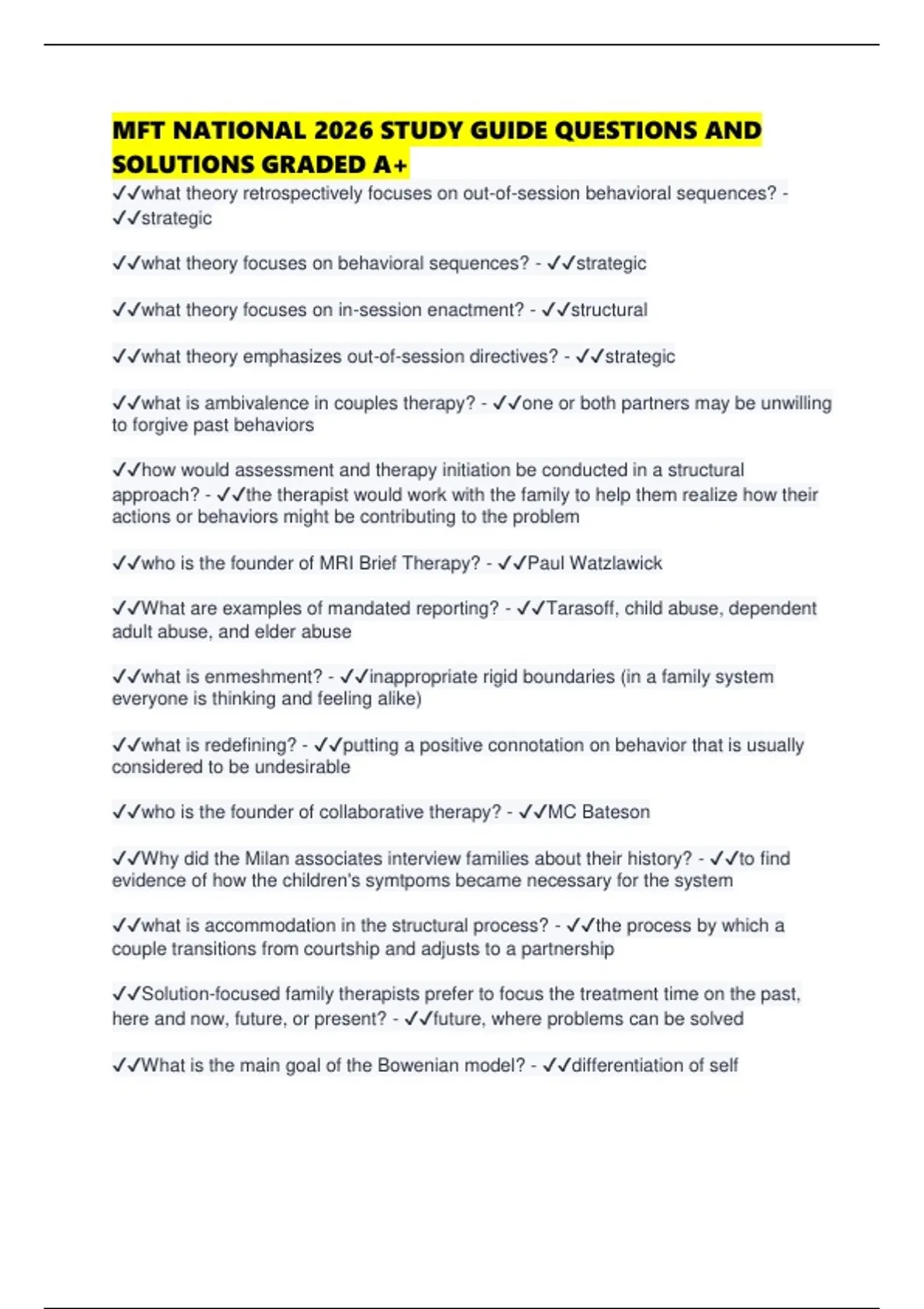 MFT NATIONAL 2026 STUDY GUIDE QUESTIONS AND SOLUTIONS GRADED A+