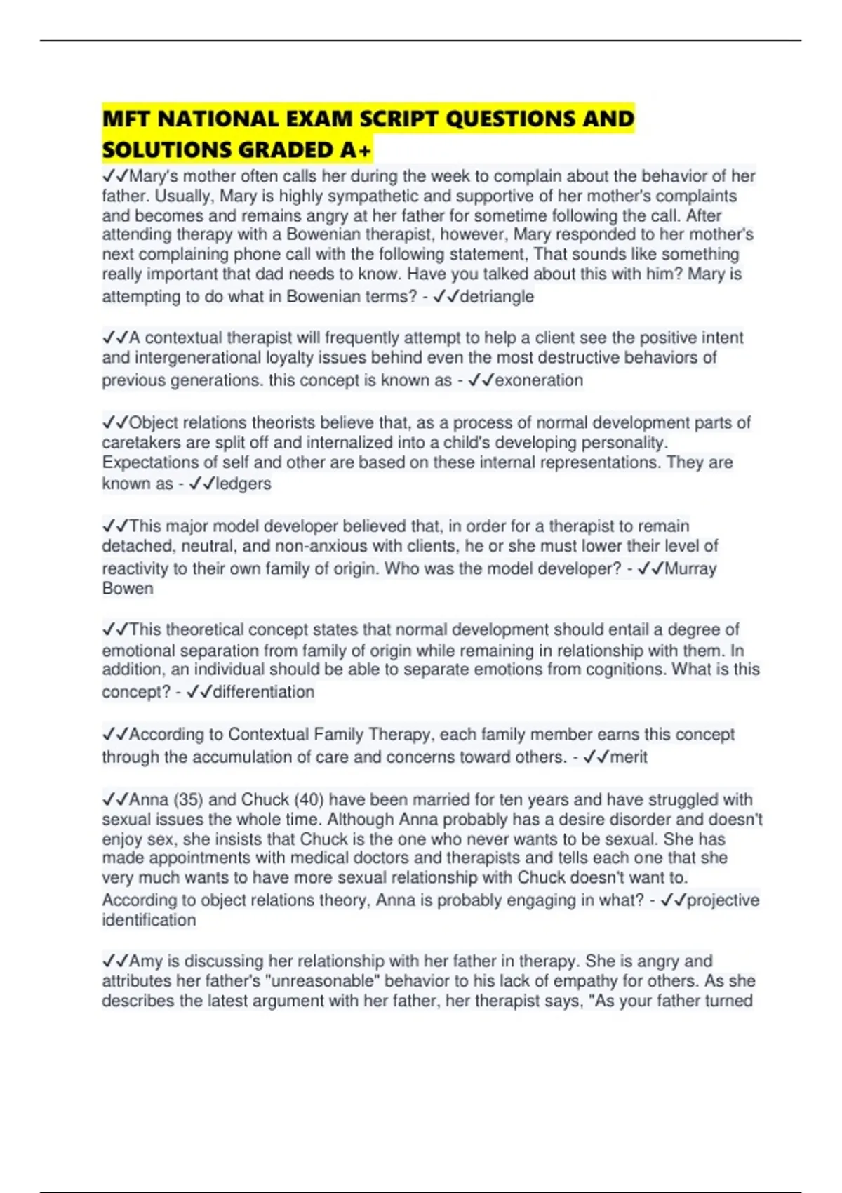MFT NATIONAL EXAM SCRIPT QUESTIONS AND SOLUTIONS GRADED A+