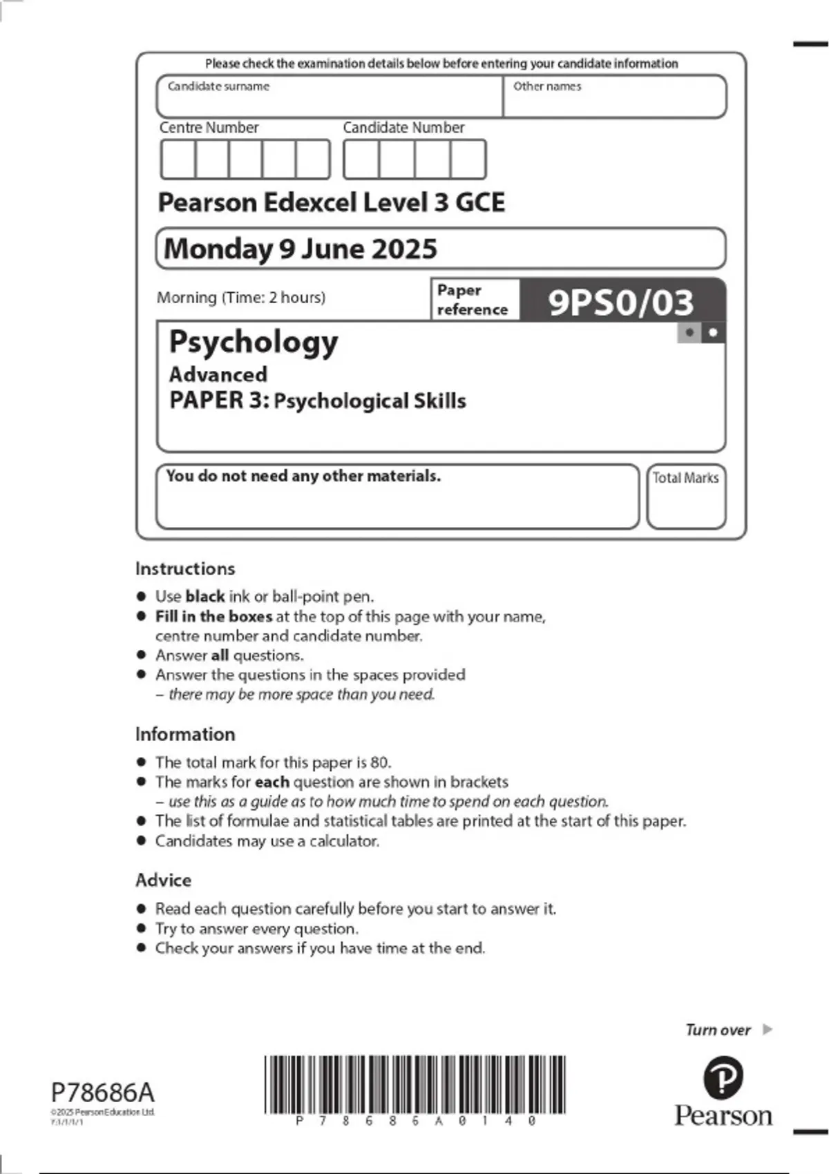 2025 Pearson Edexcel Level 3 GCE 9PS0/03 Psychology Advanced PAPER 3: Psychological Skills