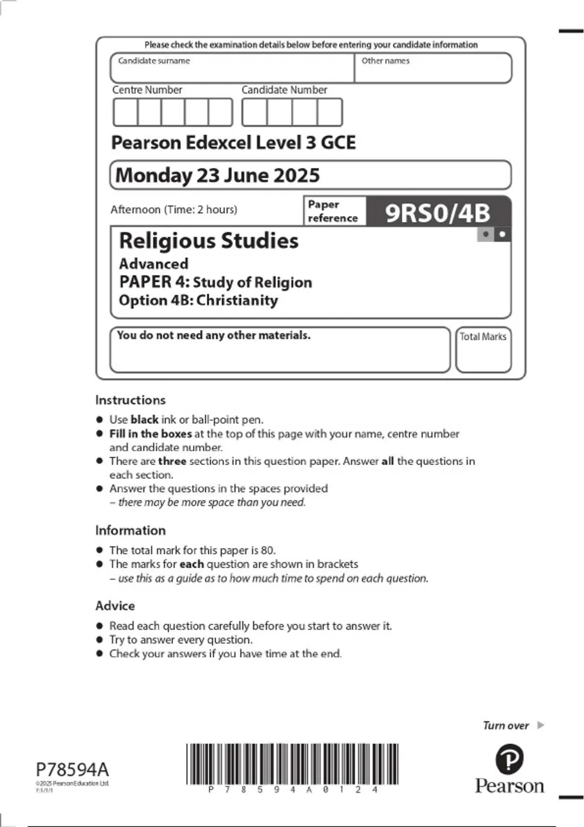 2025 Pearson Edexcel Level 3 GCE 9RS0/4B Religious Studies Advanced PAPER 4: Study of Religion Option 4B: Christianity