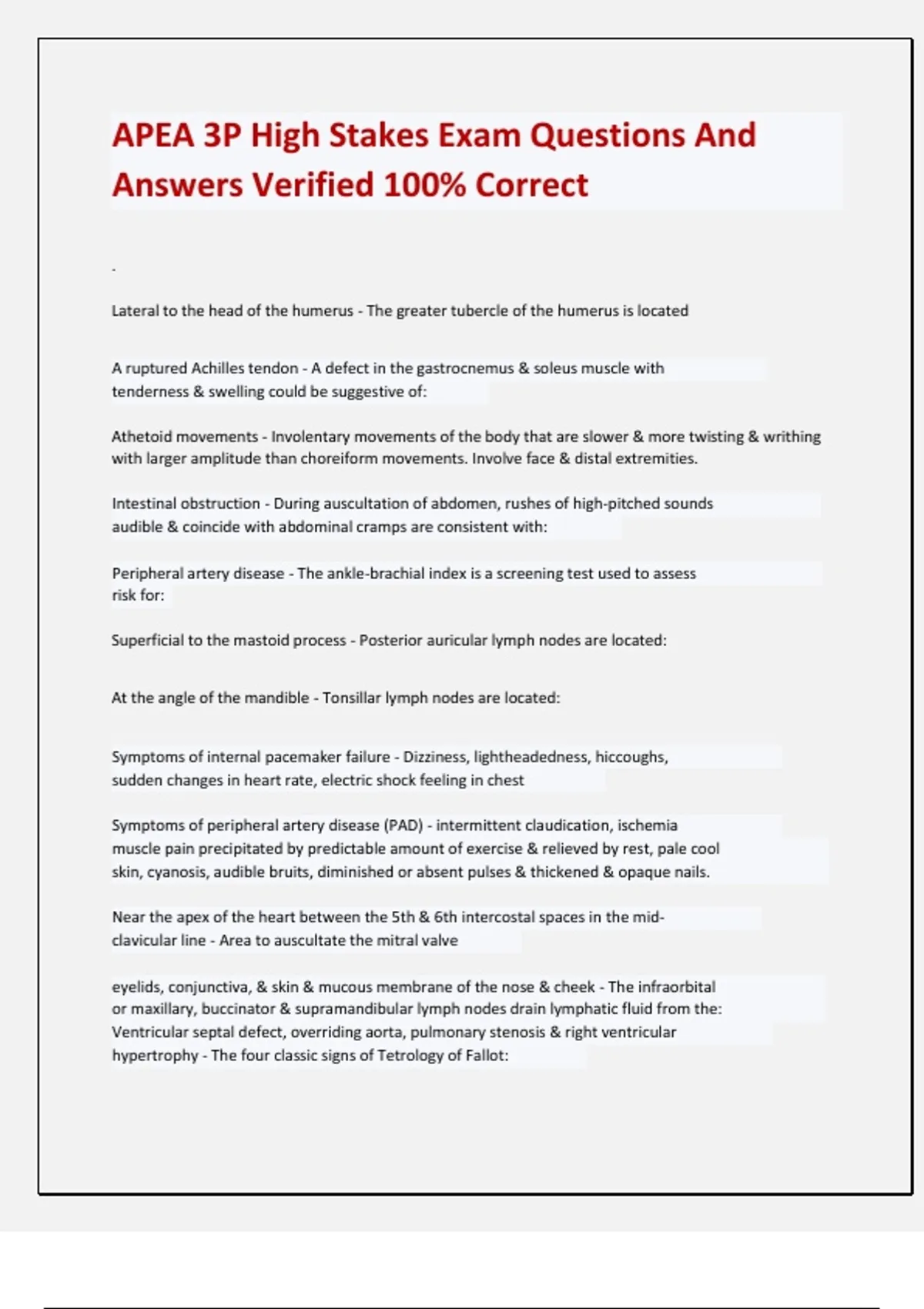APEA 3P High Stakes Exam Questions And Answers Verified 100% Correct . Lateral to the head of the humerus - The greater tubercle of the humerus is located A ruptured Achilles tendon - A defect in the gastrocnemus & soleus muscle with tenderness & swelling could be suggestive of: Athetoid movements - Involentary movements of the body that are slower & more twisting & writhing with larger amplitude than choreiform movements. Involve face & distal extremities. Intestinal obstruction - During auscultation of abdomen, rushes of high-pitched sounds audible & coincide with abdominal cramps are consistent with: Peripheral artery disease - The ankle-brachial index is a screening test used to assess risk for: Superficial to the mastoid process - Posterior auricular lymph nodes are located: At the angle of the mandible - Tonsillar lymph nodes are located: Symptoms of internal pacemaker failure - Dizziness, lightheadedness, hiccoughs, sudden changes in heart rate, electric shock feeling in chest Symptoms of peripheral artery disease (PAD) - intermittent claudication, ischemia muscle pain precipitated by predictable amount of exercise & relieved by rest, pale cool skin, cyanosis, audible bruits, diminished or absent pulses & thickened & opaque nails. Near the apex of the heart between the 5th & 6th intercostal spaces in the mid- clavicular line - Area to auscultate the mitral valve eyelids, conjunctiva, & skin & mucous membrane of the nose & cheek - The infraorbital or maxillary, buccinator & supramandibular lymph nodes drain lymphatic fluid from the: Ventricular septal defect, overriding aorta, pulmonary stenosis & right ventricular hypertrophy - The four classic signs of Tetrology of Fallot: Costochondritis - Chest pain described as stabbing, sticking or dull and aching is characteristic of: Pericarditis & pleuritic pain - Chest pain described as persistent, sharp, knife-like is characteristic of: Neurogenic claudication - pain with walking or prolonged standing, radiating from the spinal area into the buttocks, thighs, lower legs, or feet posterior part of the temporoparietal region - The posterior auricular lymph nodes drain lymphatic fluid from the: between the 2nd & 3rd intercostal spaces at the right upper sternal border - Auscultate the aortic listening point in the: between 2nd & 3rd intercostal spaces at the left sternal border - Pulmonic listening point auscultated: between 3rd, 4th, 5th and 6th intercostal spaces at the left lower sternal border - Tricuspid listening point is auscultated: breast, upper part of abdominal wall, upper part of back, pectoral region & upper limbs - The axillary lymph nodes drain lymphatic fluid from: chronic venous insufficiency - Brownish discoloration or ulcers just above malleolus suggests: Right upper thorax - The thoracic duct drains lymphatic fluid from the majority of the body except the: Rheumatic heart disease - erythema marginatum, chorea, murmur, joint pain & SOB are classic symptoms of: Kawasaki disease - unexplained fever for 5 days along with 4 out of 5 of the following symptoms: bilateral non-purulent conjunctivitis, cervical lymphadenopathy, edema of the hands &/or feet, strawberry tongue & macular rash. Endocarditis - fever, lethargy, petechiae, neurological involvement, Janeway lesions & Osler's nodes are symptoms of: Physiologic murmur - A murmur a