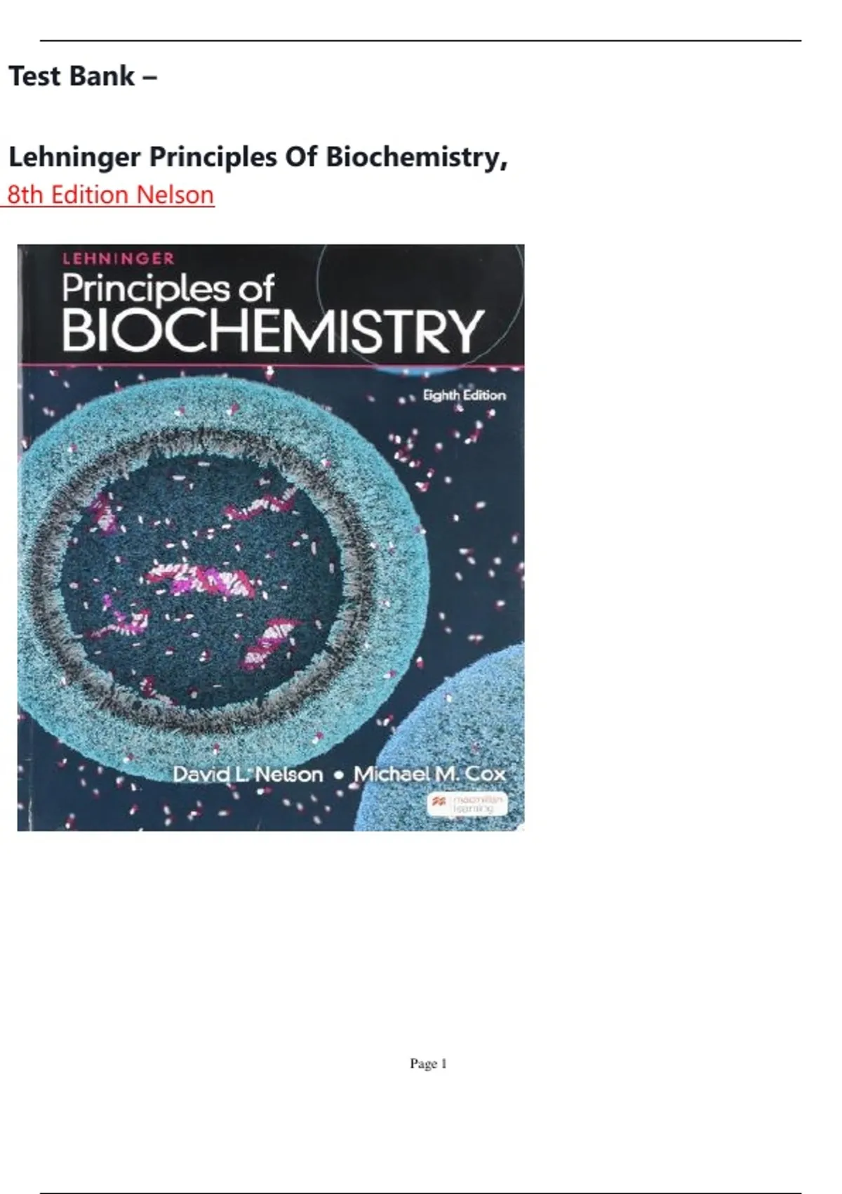 Test Bank - Lehninger Principles of Biochemistry, 8th Edition (Nelson) Chapter 1-28 | All Chapters