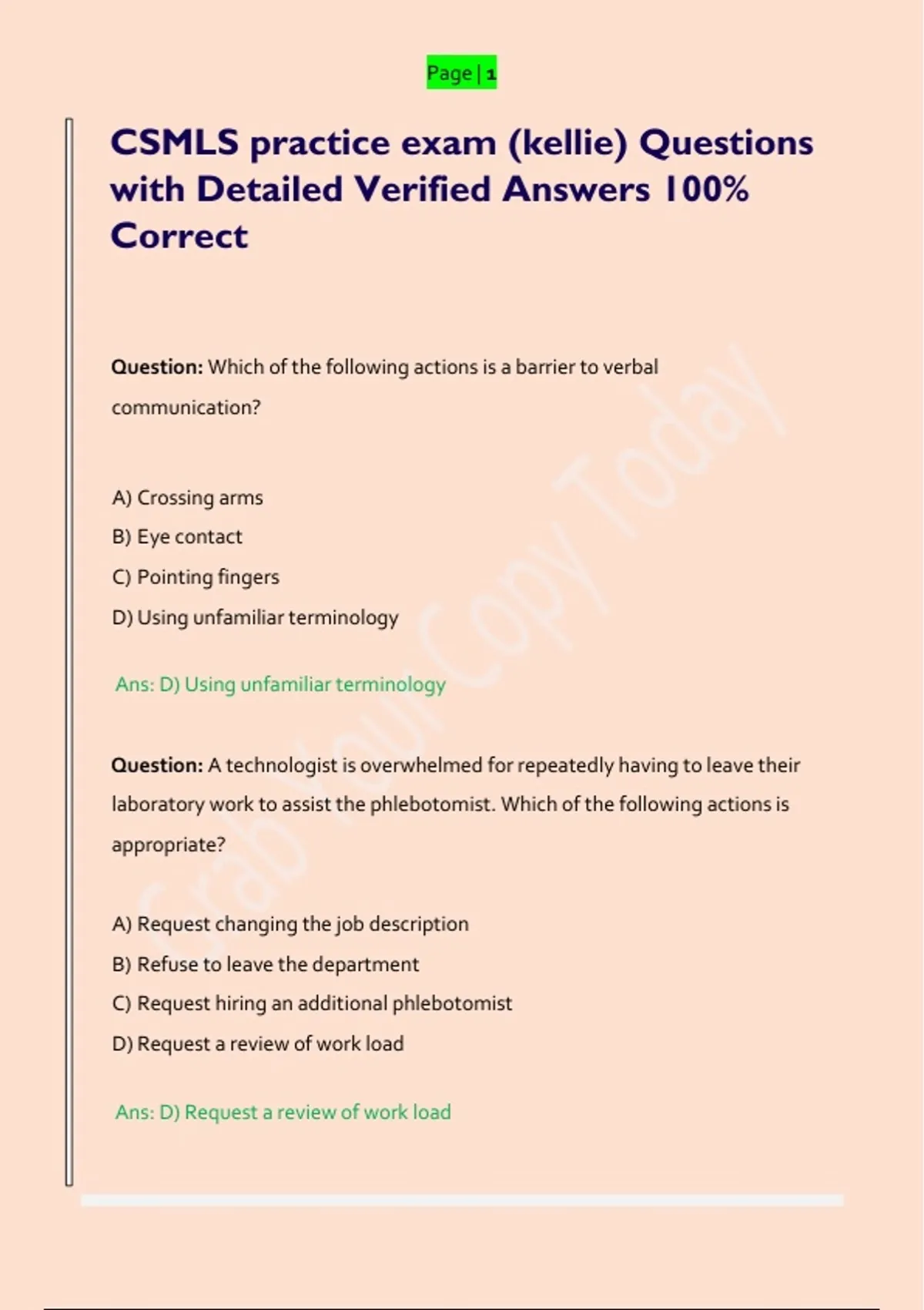 CSMLS practice exam (kellie) Questions with Detailed Verified Answers 100% Correct Question: Which of the following actions is a barrier to verbal communication? A) Crossing arms B) Eye contact C) Pointing fingers D) Using unfamiliar terminology Ans: D) Using unfamiliar terminology Question: A technologist is overwhelmed for repeatedly having to leave their laboratory work to assist the phlebotomist. Which of the following actions is appropriate? A) Request changing the job description B) Refuse to leave the department C) Request hiring an additional phlebotomist D) Request a review of work load Ans: D) Request a review of work load Page | 2 Question: Which of the following actions should be taken immediately after the laboratory implements a new anaerobic collection swab system? A) Survey care providers to evaluate the change B) Provide an education session for care providers C) Perform an employee evaluation D) Implement change management process Ans: A) Survey care providers to evaluate the change Question: How should a urine specimen at room temperature be handled when it has been received in the lab at 1900 for urinalysis and culture and sensitivity when the collection time states 1500? A) Reject the specimen B) Place specimen in the fridge C) Place specimen in incubator D) Process the specimen Ans: A) Reject the specimen Question: Which of the following positive urine reagent strip tests correlate with a urinary tract infection due to Enterobacteriaceae? A) Leukocyte and nitrite B) Blood and glucose C) Glucose and nitrite D) Specific gravity and protein Page | 3 Ans: A) Leukocyte and nitrite Question: Which of the following criteria describes a positive control for routine red blood cell phenotyping? A) Dominant for the antigen being tested B) Recessive for the antigen being tested C) Heterozygous for the antigen being tested D) Homozygous for the antigen being tested Ans: C) Heterozygous for the antigen being tested Question: Which of the following actions should be taken if a unit of packed red blood cells is returned to the blood bank at a temperature of 0°C? A) Reissue the unit to the same patient B) Reissue the unit to a different patient C) Discard the unit D) Quarantine the unit Ans: C) Discard the unit Question: Given the following results, what is the calculated serum osmolarity (mOsm/L)? Urea: 21.4 mmol/L Glucose: 7.3 mmol/L Sodium: 133 mmol/L