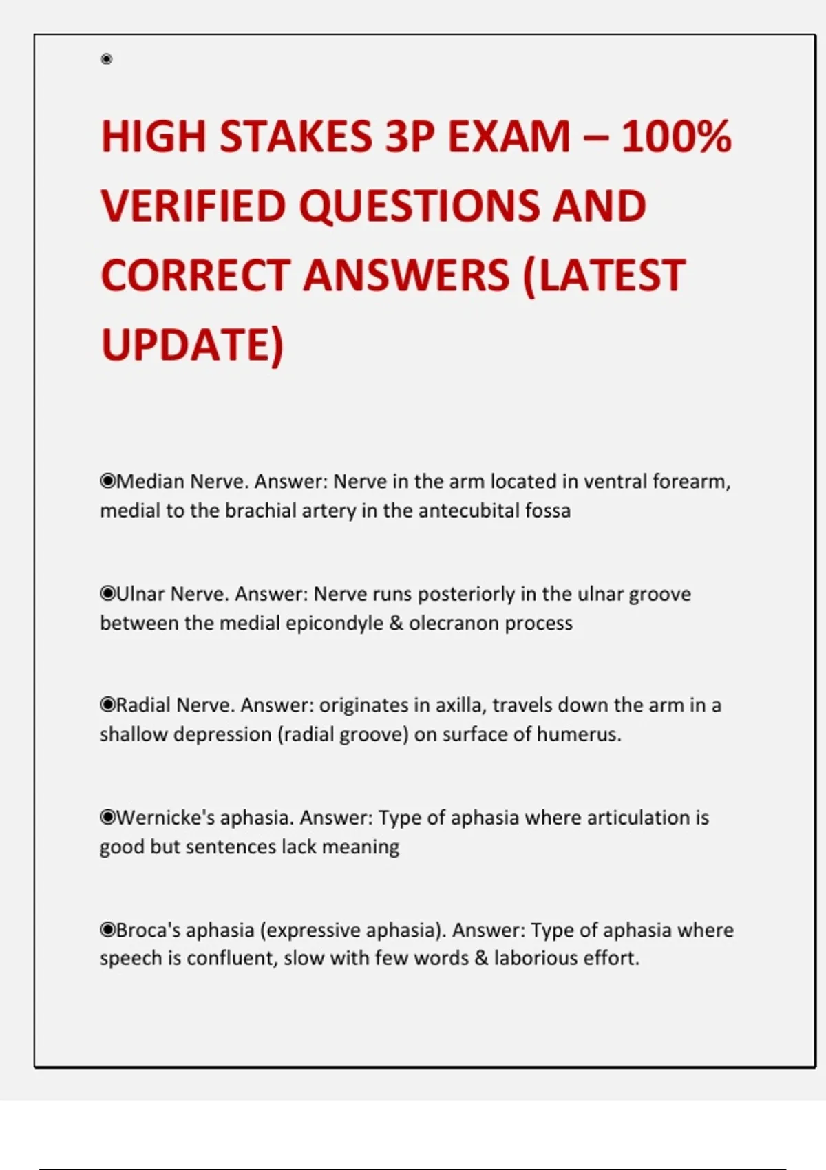 HIGH STAKES 3P EXAM – 100% VERIFIED QUESTIONS AND CORRECT ANSWERS (LATEST UPDATE) ◉ Median Nerve. Answer: Nerve in the arm located in ventral forearm, medial to the brachial artery in the antecubital fossa ◉ Ulnar Nerve. Answer: Nerve runs posteriorly in the ulnar groove between the medial epicondyle & olecranon process ◉ Radial Nerve. Answer: originates in axilla, travels down the arm in a shallow depression (radial groove) on surface of humerus. ◉ Wernicke's aphasia. Answer: Type of aphasia where articulation is good but sentences lack meaning ◉ Broca's aphasia (expressive aphasia). Answer: Type of aphasia where speech is confluent, slow with few words & laborious effort. Frailty. Answer: A multifactorial geriatric condition or syndrome characterized by an age-related lack of adaptive physiological capacity without identifiable illness. ◉ Aphthous ulcers. Answer: "canker sores"; small, painful, round or oval ulcers in the oral mucosa. White, yellowish gray in color & surrounded by halo of reddened mucosa. ◉ Corneal arcus. Answer: On ophthalmoscopic exam, thin grayish white arc on lower end of the cornea. ◉ Weber Test. Answer: Screening test to detect sensorineural and conductive hearing loss ◉ Chadwick's sign. Answer: Bluish purple discoloration of the cervix, vagina, and labia during pregnancy as a result of increased vascular congestion. ◉ Aortic Stenosis. Answer: A loud murmur with a thrill audible in right 2nd intercostal space, radiates to carotid arteries. Crescendodecrescendo pitch audible at the apex. Murmur heard best when sitting & leaning forward. ◉ Lateral to the head of the humerus. Answer: The greater tubercle of the humerus is located ◉ A ruptured Achilles tendon. Answer: A defect in the gastrocnemus & soleus muscle with tenderness & swelling could be suggestive of: ◉ Athetoid movements. Answer: Involentary movements of the body that are slower & more twisting & writhing with larger amplitude than