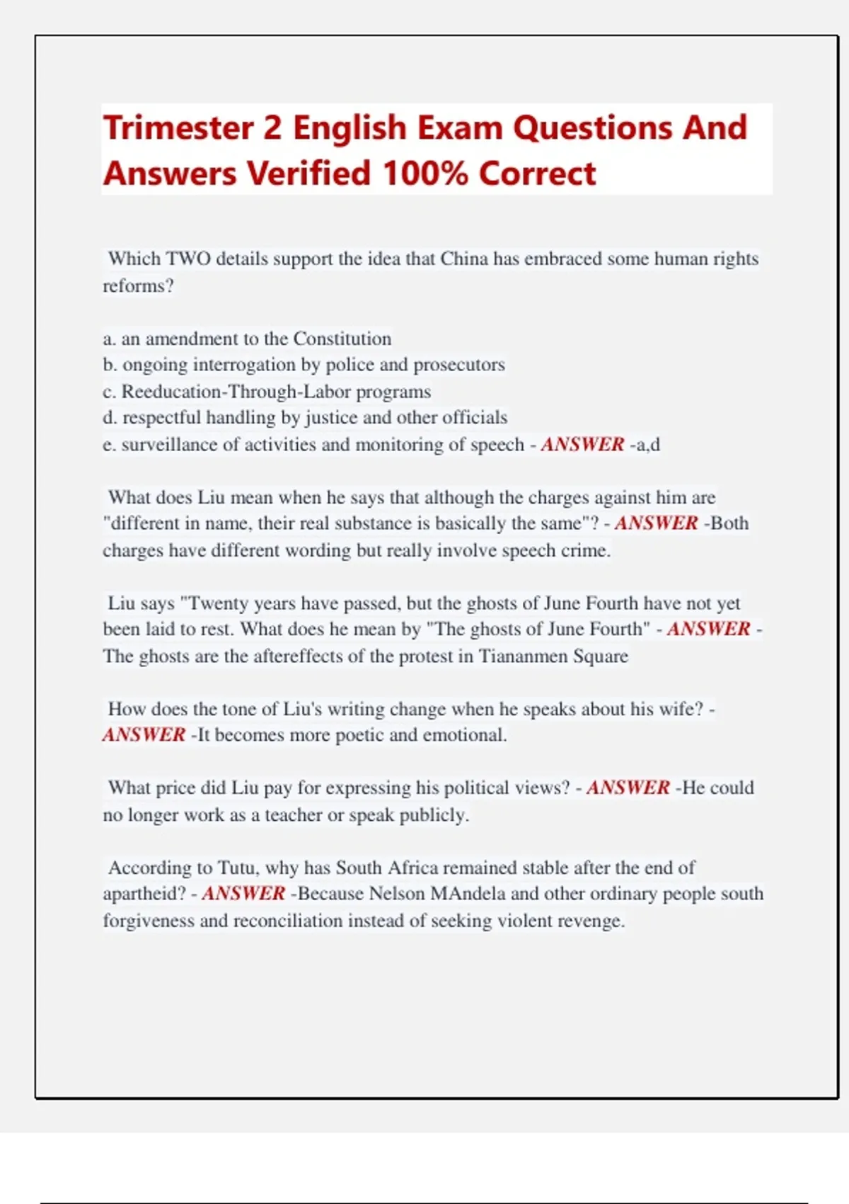Trimester 2 English Exam Questions And Answers Verified 100% Correct Which TWO details support the idea that China has embraced some human rights reforms? a. an amendment to the Constitution b. ongoing interrogation by police and prosecutors c. Reeducation-Through-Labor programs d. respectful handling by justice and other officials e. surveillance of activities and monitoring of speech - ANSWER -a,d What does Liu mean when he says that although the charges against him are "different in name, their real substance is basically the same"? - ANSWER -Both charges have different wording but really involve speech crime. Liu says "Twenty years have passed, but the ghosts of June Fourth have not yet been laid to rest. What does he mean by "The ghosts of June Fourth" - ANSWER The ghosts are the aftereffects of the protest in Tiananmen Square How does the tone of Liu's writing change when he speaks about his wife? - ANSWER -It becomes more poetic and emotional. What price did Liu pay for expressing his political views? - ANSWER -He could no longer work as a teacher or speak publicly. According to Tutu, why has South Africa remained stable after the end of apartheid? - ANSWER -Because Nelson MAndela and other ordinary people south forgiveness and reconciliation instead of seeking violent revenge. What does the idiom " so quiet you could here a pin drop" mean? - ANSWER -It means a silence so profound that even the slightest sound, such as that of a pin could be heard. What is Desmond Tutu's tone in his speech? - ANSWER -positive, hopeful and celebrating "Can an Evil Man Change?" is written from the point of view of - ANSWER -a journalist. Read the following excerpt from "Can an Evil Man Change?" With his intimate knowledge of apartheid-era security agencies, ĮMr. de Kock) began to assist victims in finding the remains of loved ones. He provided ANSWERs and pointed to places where bodies could be found. Which rhetorical device does the author use to support her claim that de Kock has changed? - ANSWER -logos In "Can an Evil Man Change?" what is significant about the question of whether de Kock has changed? a. It suggests that an evil system taught men like him to be evil. b. It makes it difficult to believe that South Africans can ever be reconciled. c. It gives whites a reason to admit the ways they have benefited from apartheid. d. It raises the question of how South Africans can deal with the truth about their past. - ANSWER -a Read this excerpt from "Let South Africa Show the World How to Forgive. "... we believe in Ubuntu-the essence of being human, that idea that we are all caught up in a delicate network of interdependence. We say, "A person is a person through other persans." I need you in order to be me and you need me in order to be you. How does Desmond Tutu use the concept of Ubuntu to support his point of view? - ANSWER -He appeals to a shared moral value How does Desmond Tutu explain why South Africa did not suffer a "bloodbath" after apartheid ended? a. He contrasts restorative justice with other types of justice. b. He credits the adoption of a "blanket amnesty policy. c. He acknowledges the success of democratic elections. d. He says South Africa successfully implemented "victor's justice." - ANSWER -a Read the following excerpt from "Let South Africa Show the World How to Forgive. Our country could not afford the exorbitant cost of trials, even if we could have held them and had the evidence to satisfy a court of law. The word exorbitant has a __________ connotation. - ANSWER -negative Which sentence shows an INCORRECT use of a compound adjective? - ANSWER -Andrea appears to be a highly-motivated student. obstinate - ANSWER -adj.: stubborn or inflexible avidly - ANSWER -adv.: enthusiastically or greedily disconcerted - ANSWER -adj.: in a sudden state of confusion denounce - ANSWER -v.: condemn publicly; betray or accuse fraternized - ANSWER -v.: associated or mingled aş brothers would furtive - ANSWER -adj.: done in a secret or sly way rapture - ANSWER -n.: joyful ecstasy