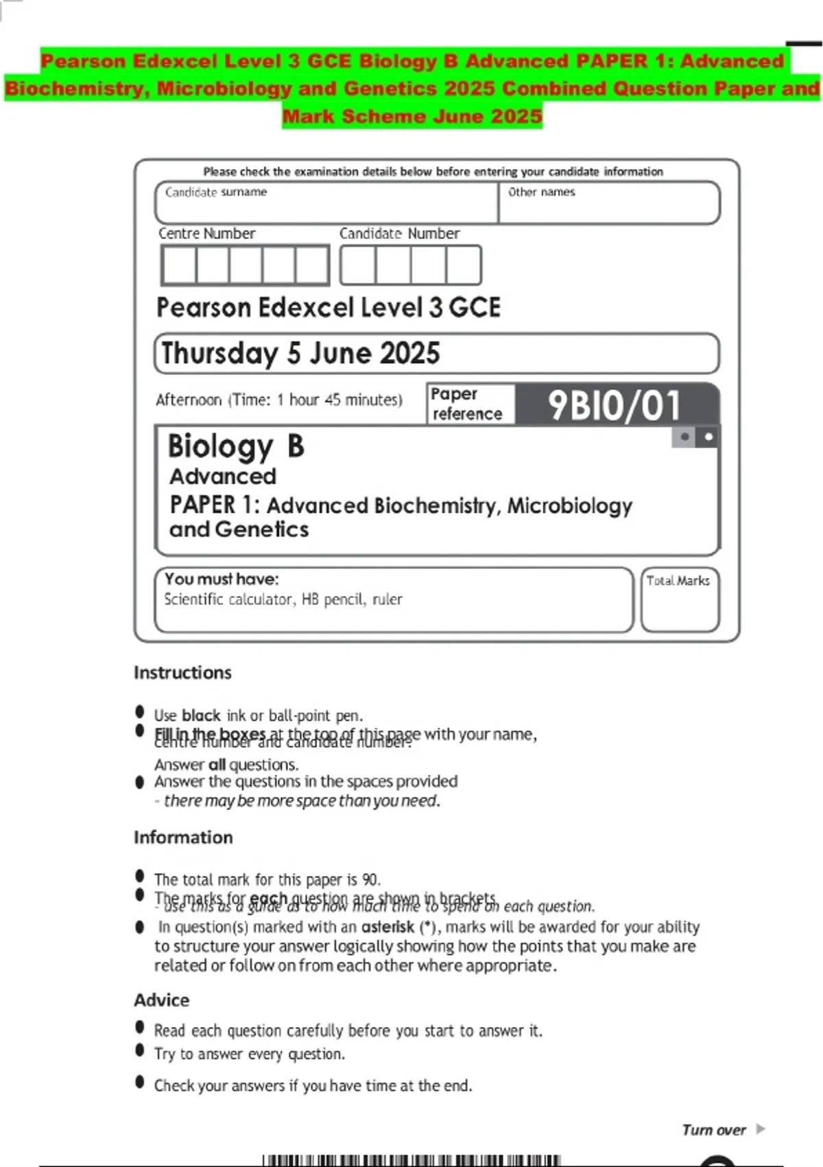 Pearson Edexcel Level 3 GCE Biology B Advanced PAPER 1: Advanced Biochemistry, Microbiology and Genetics 2025 Combined Question Paper and Mark Scheme June 2025