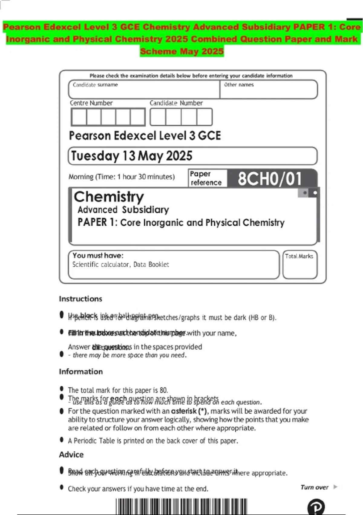 BUNDLE ::: Pearson Edexcel Level 3 GCE Chemistry 2025 Combined Question Paper and Mark Scheme