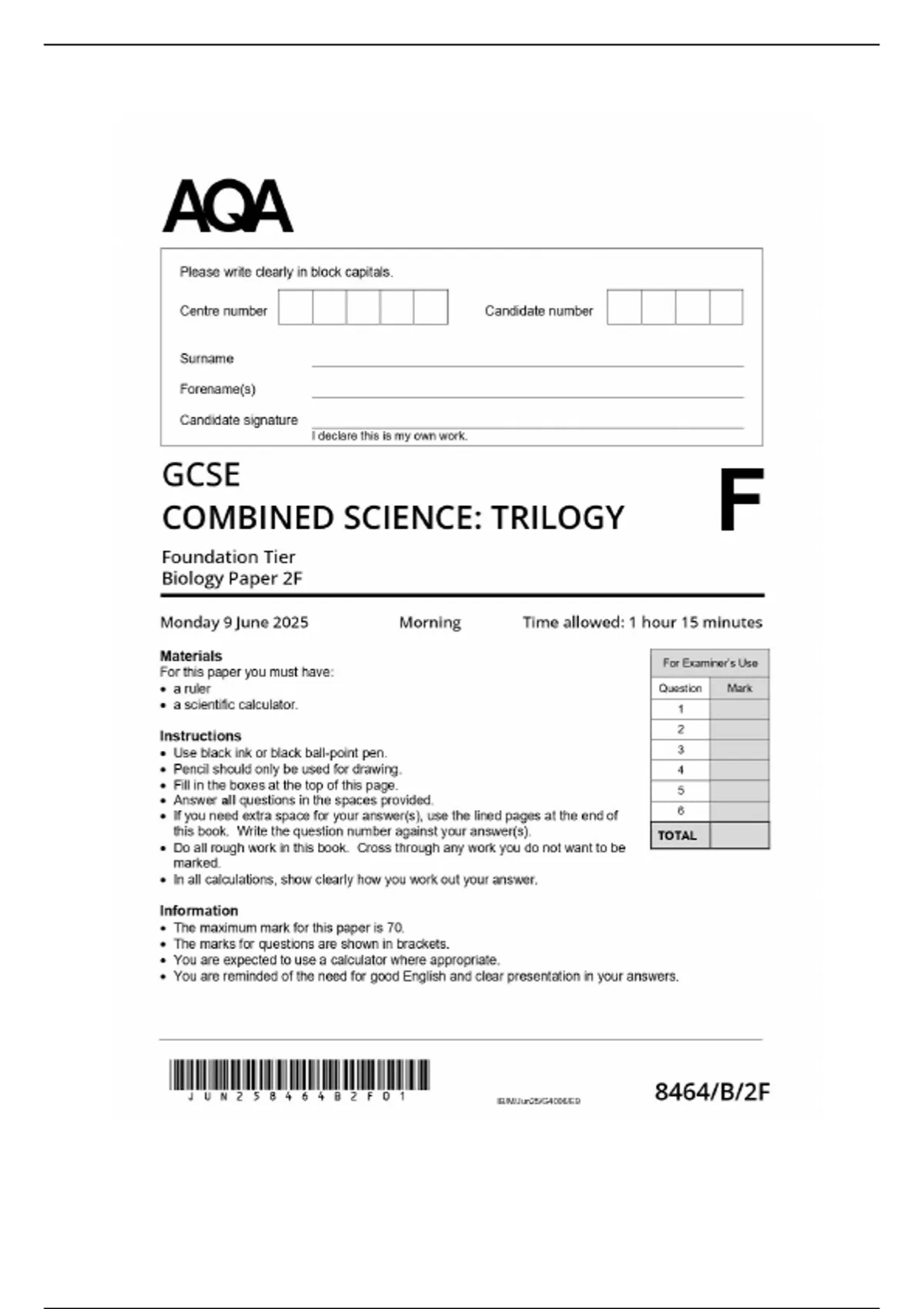 GCSE Biology Paper 2 (Combined Science Trilogy 2025) – Foundation Tier merged question paper & Mark Scheme