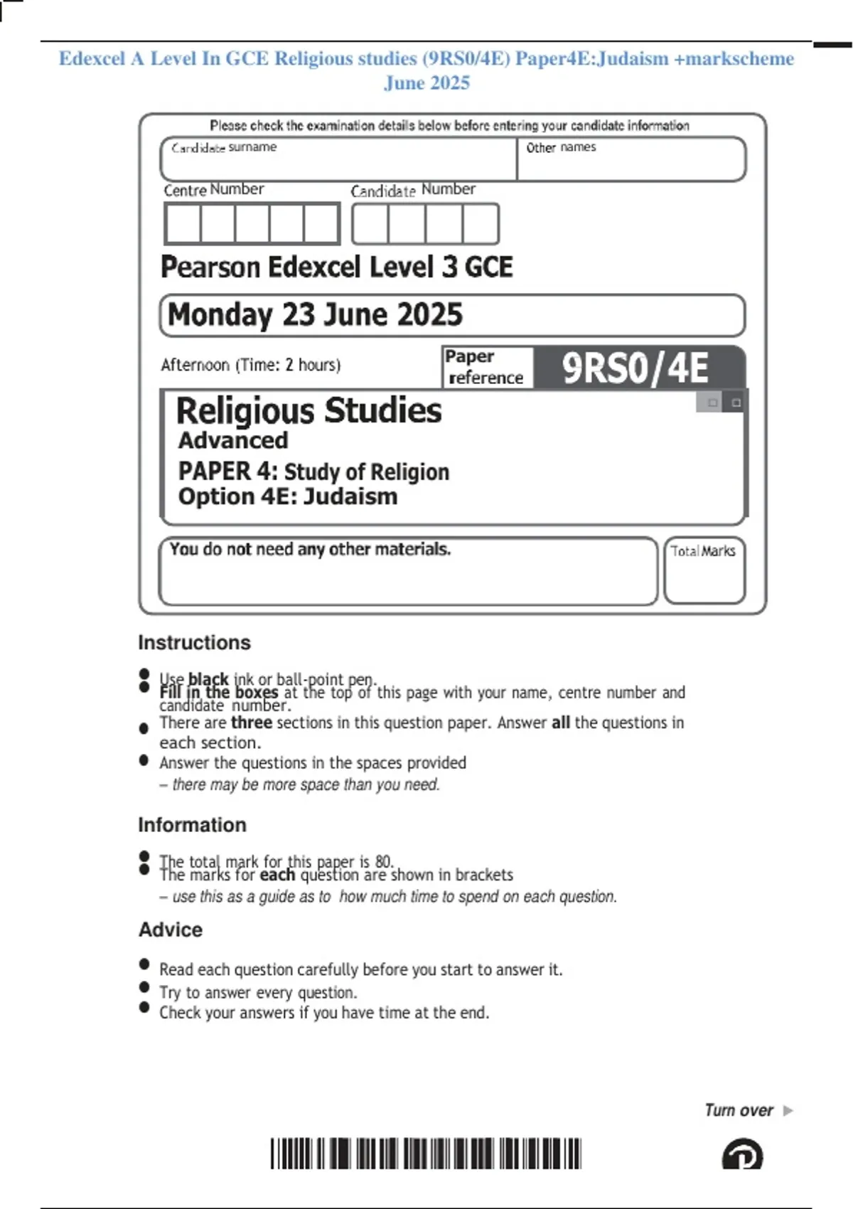 Edexcel A Level In GCE Religious studies (9RS0/4E) Paper4E:Judaism +markscheme June 2025