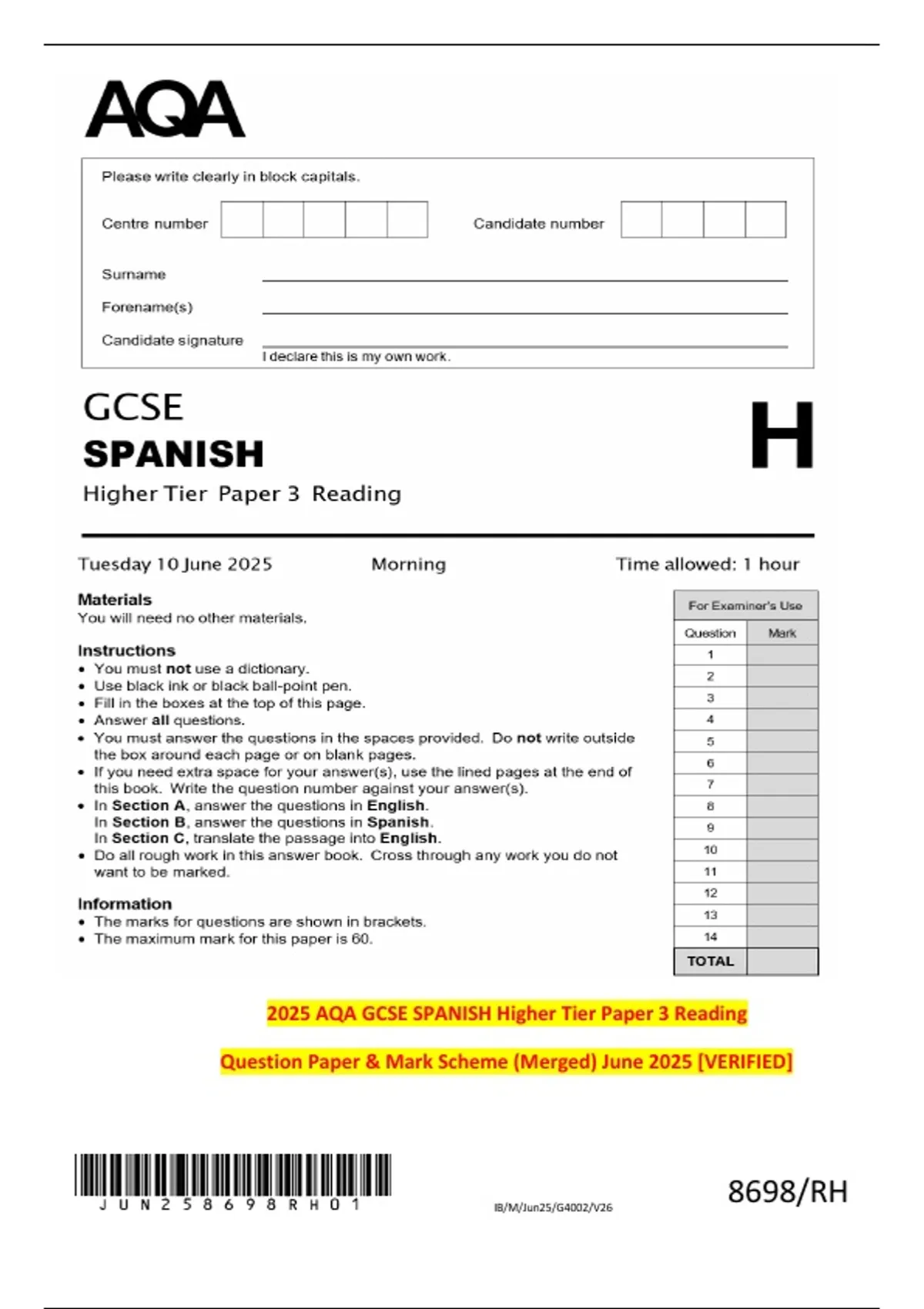 2025 AQA GCSE SPANISH Higher Tier Paper 3 Reading Question Paper & Mark Scheme (Merged) June 2025 [VERIFIED]