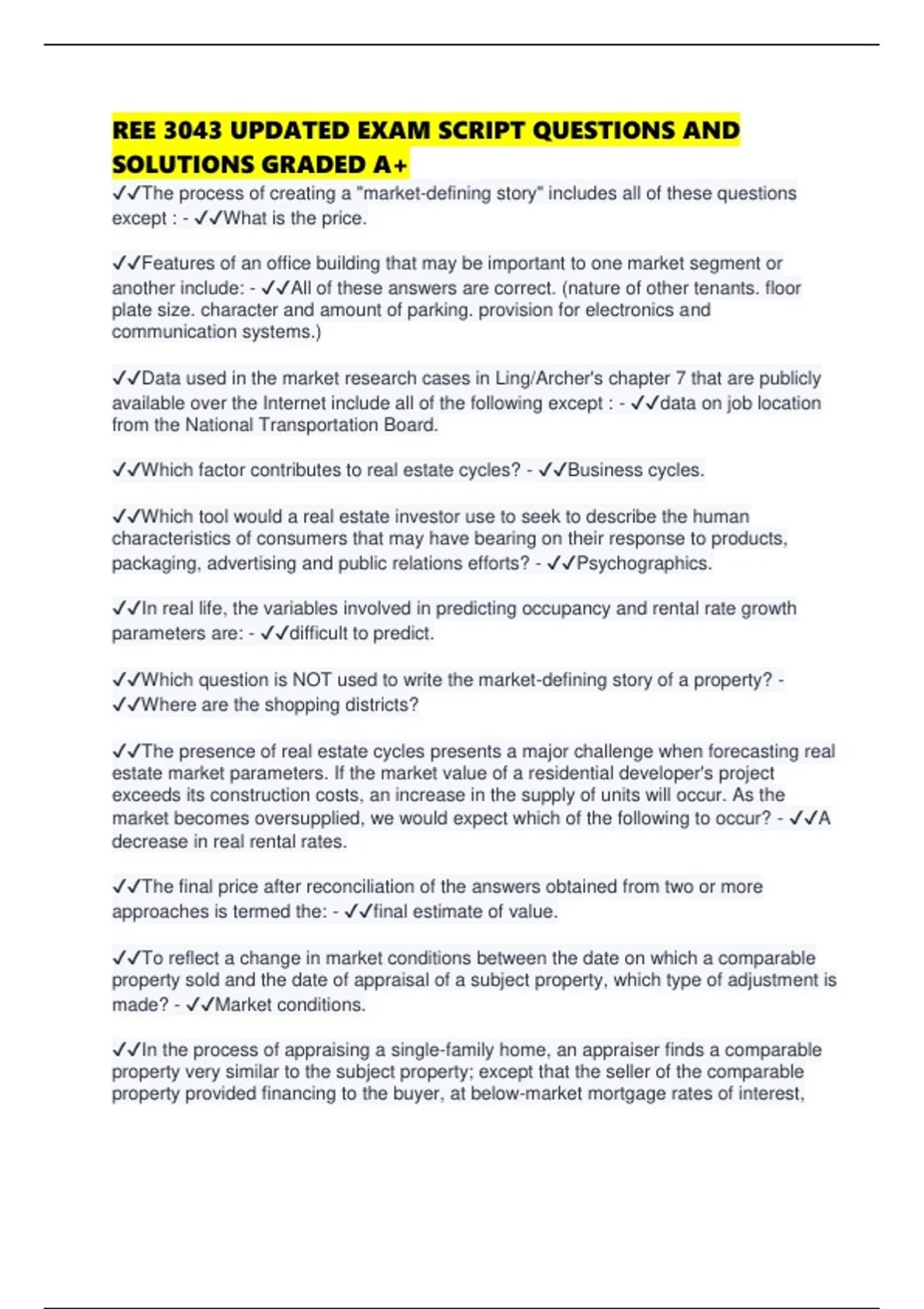 ✔✔Which question is NOT used to write the market-defining story of a property? -