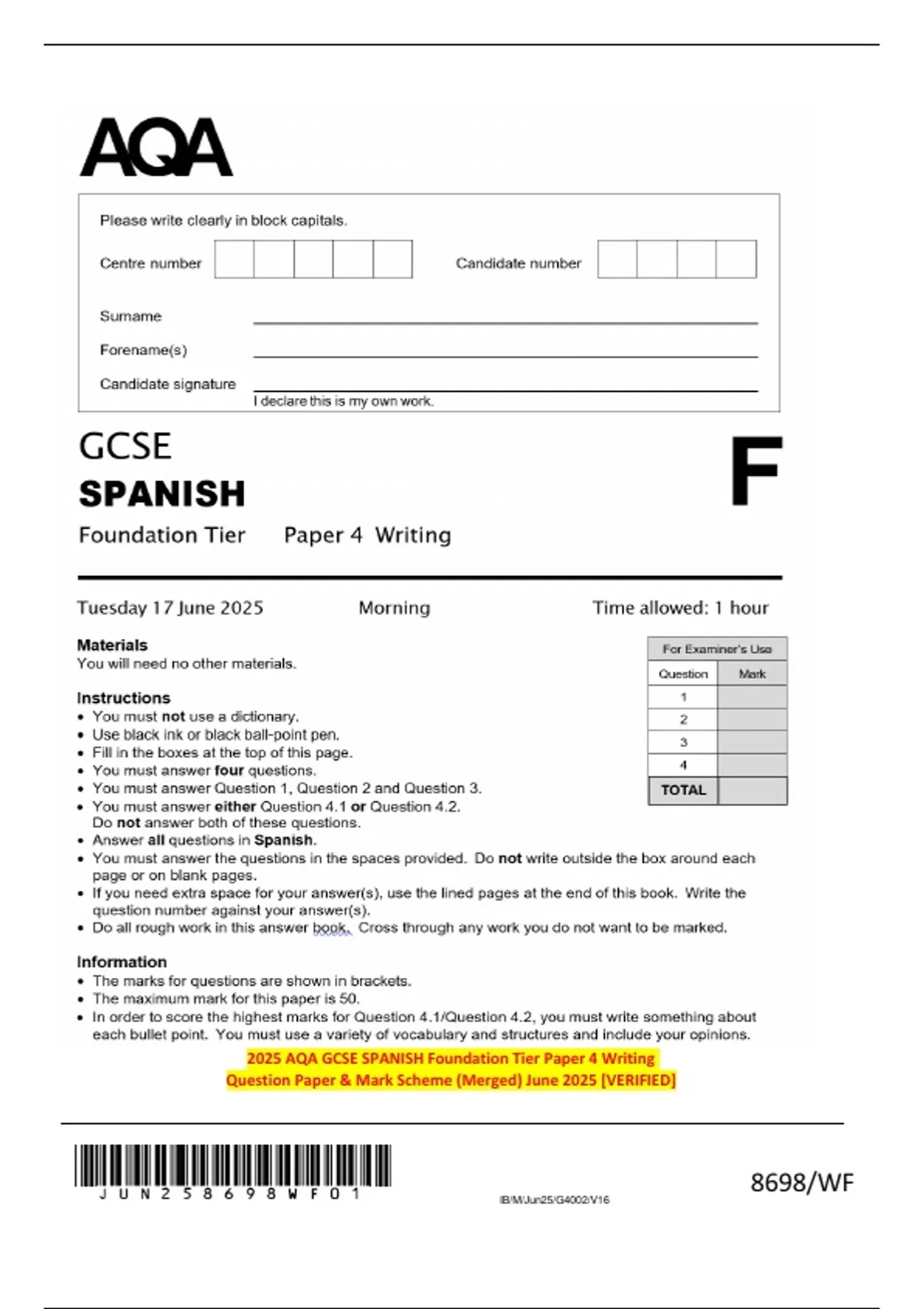 2025 AQA GCSE SPANISH Foundation Tier Paper 4 Writing Question Paper & Mark Scheme (Merged) June 2025 [VERIFIED]