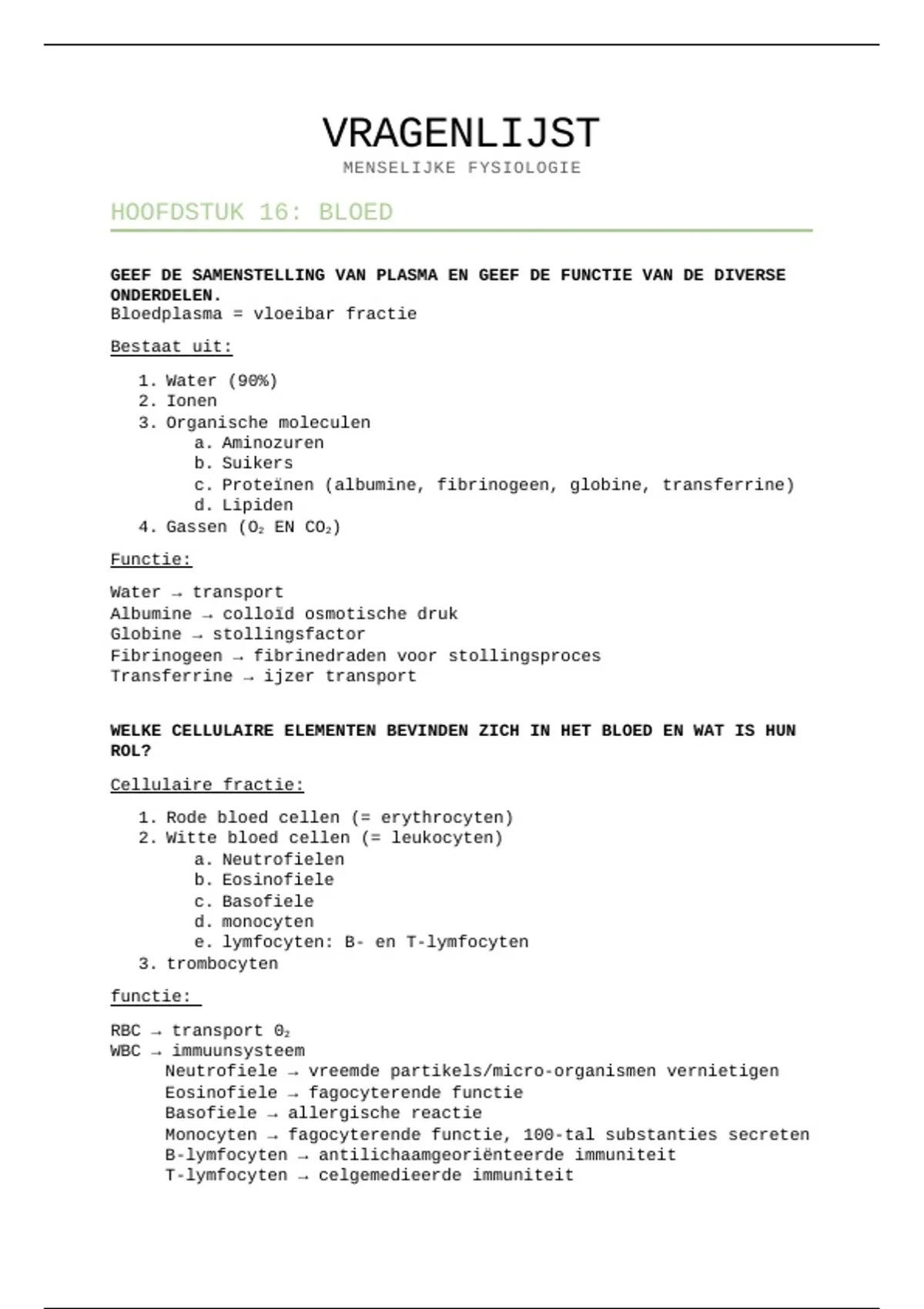 GEEF DE SAMENSTELLING VAN PLASMA EN GEEF DE FUNCTIE VAN DE DIVERSE