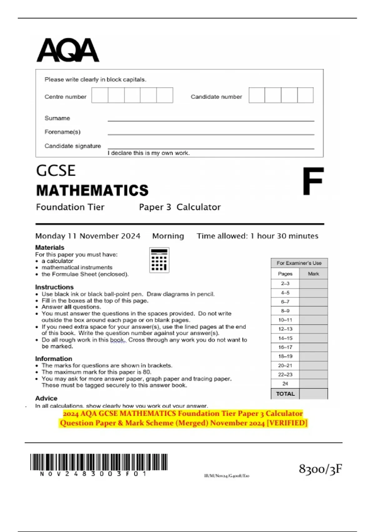 2024 AQA GCSE MATHEMATICS Foundation Tier Paper 3 Calculator