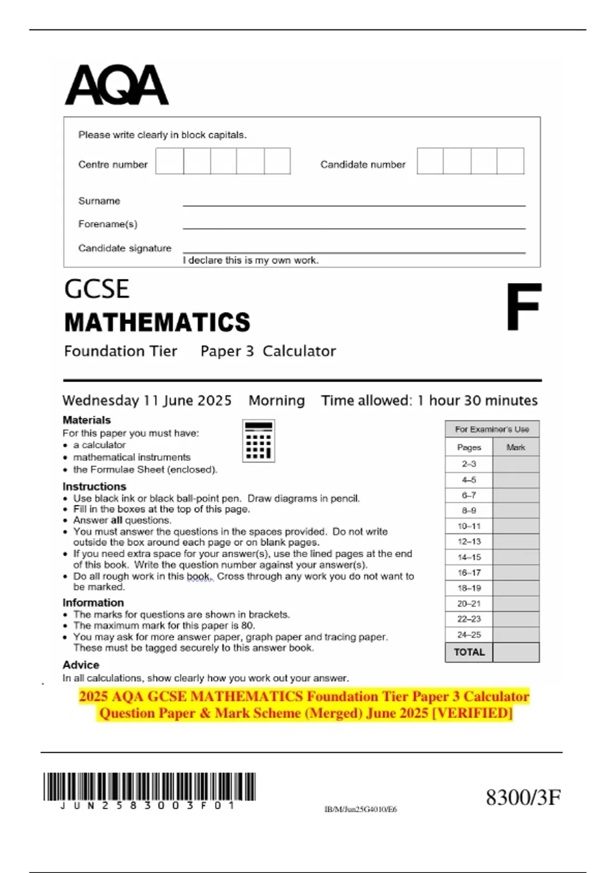 2025 AQA GCSE MATHEMATICS Foundation Tier Paper 3 Calculator