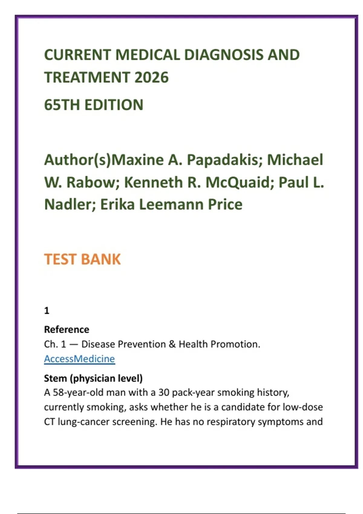 CURRENT Medical Diagnosis & Treatment 2026 Test Bank | CMDT 65th Ed MCQs | Clinical Medicine & USMLE-Style Exam Prep 2️⃣ SEO Product Description (200–300 words) Master clinical reasoning and exam performance with this CURRENT Medical Diagnosis & Treatment 2026 (65th Edition) Test Bank, meticulously designed to reinforce real-world diagnostic and management decision-making. Built directly from CMDT 2026, the most trusted, clinician-authored reference in medical education, this digital question bank delivers full textbook coverage across every system and chapter. Each chapter includes 20 high-quality, exam-style MCQs that reflect the ambiguity and complexity of real clinical practice. Questions are case-based and emphasize differential diagnosis, risk stratification, evidence-based investigations, and guideline-concordant management, mirroring the cognitive demands of clinical rotations, shelf exams, and postgraduate assessments. Every question includes a verified correct answer with detailed clinical rationales, explaining not only what is correct, but why—and why competing options are less appropriate. This structure accelerates learning, sharpens diagnostic accuracy, and strengthens long-term retention. Ideal for learners using CURRENT Medical Diagnosis & Treatment in: Internal Medicine & Family Medicine Clinical Medicine & Primary Care Adult Health & Advanced Medical-Surgical Courses USMLE Step 2 CK & Step 3 preparation Physician Assistant (PA) medical management courses Nurse Practitioner (NP) and advanced nursing programs Key Features: Complete CMDT 2026 coverage — all chapters, all systems 20 high-yield MCQs per chapter USMLE-style, clinically realistic scenarios Evidence-based explanations aligned with standard-of-care Designed to improve clinical judgment, not rote memorization Digital, time-saving, and exam-focused This test bank transforms CMDT from a reference into a powerful active-learning and exam-prep tool—ideal for students and clinicians who demand accuracy, depth, and results. 3️⃣ High-Value SEO Keywords (8) CURRENT Medical Diagnosis and Treatment test bank CMDT 2026 MCQs clinical medicine question bank internal medicine exam questions USMLE Step 2 CK style questions family medicine test bank medical diagnosis MCQs PA NP clinical medicine exam prep 4️⃣ Hashtags (10) #MedicalTestBank #CMDT2026 #ClinicalMedicine #InternalMedicine #FamilyMedicine #USMLEPrep #PAStudent #NPStudent #MedicalEducation #ExamPrep