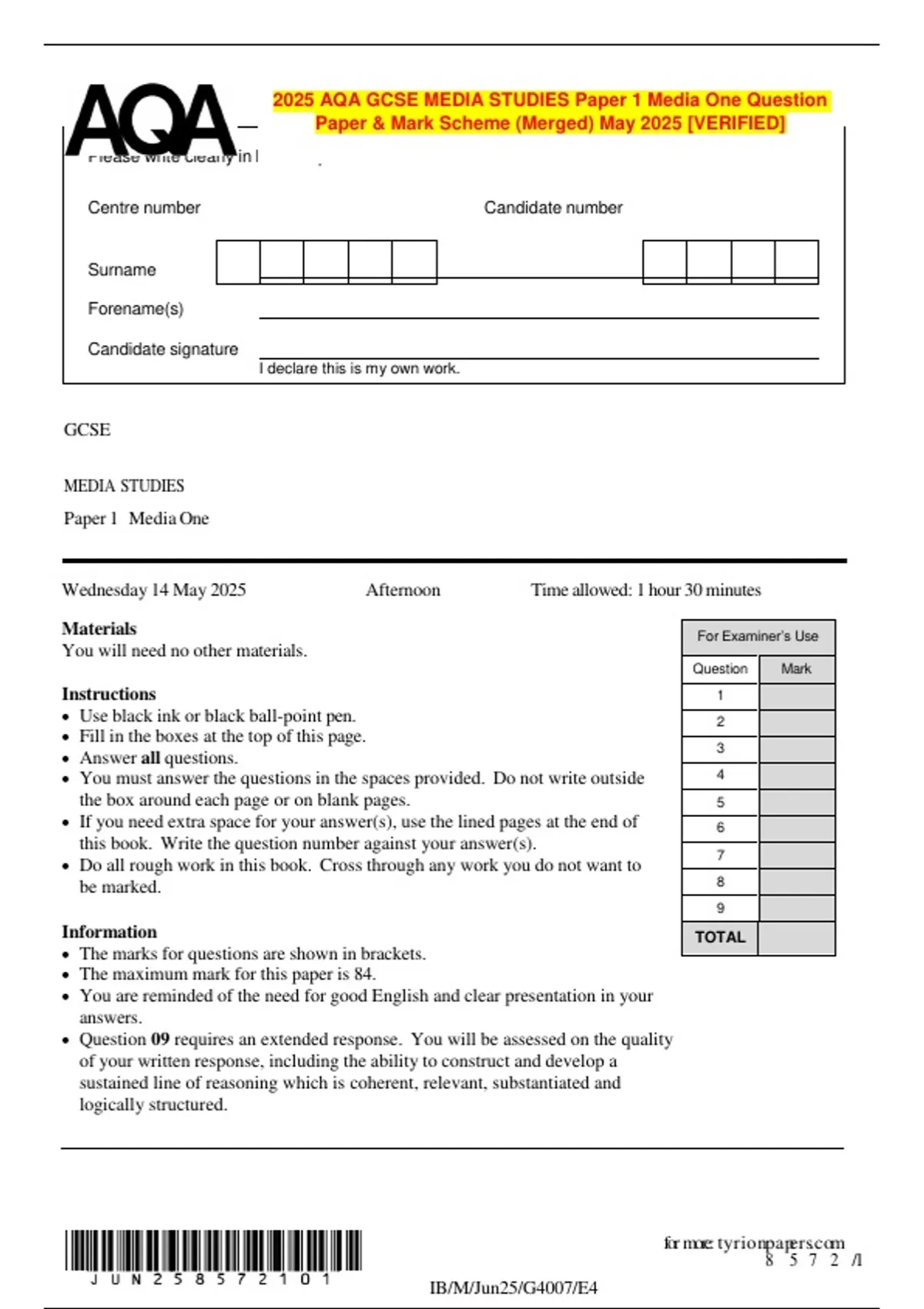 2025 AQA GCSE MEDIA STUDIES Paper 1 Media One Question Paper & Mark Scheme (Merged) May 2025 [VERIFIED]