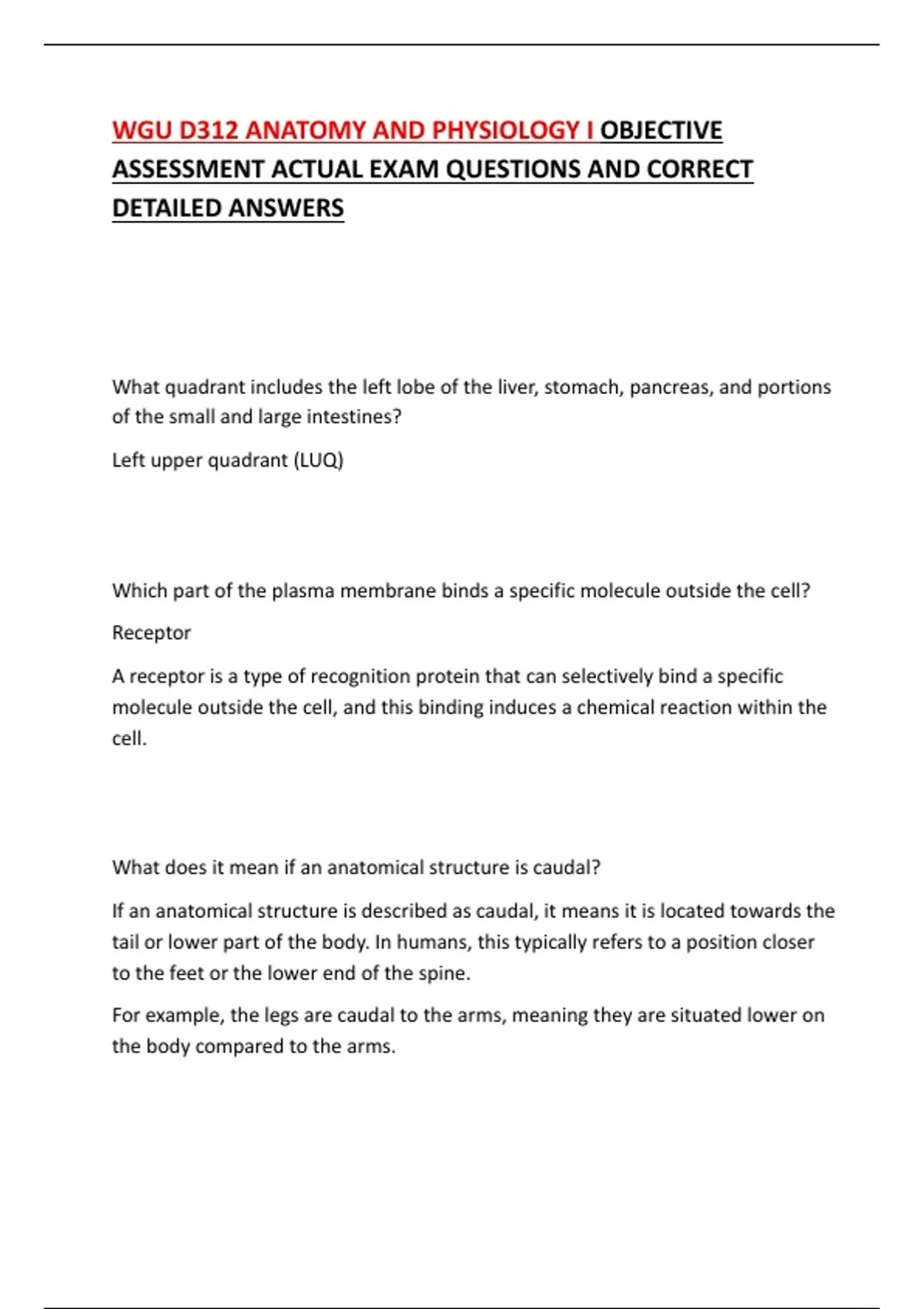 This document provides a comprehensive collection of actual-style objective assessment questions for WGU D312 Anatomy and Physiology I, each paired with clear and detailed correct answers. It covers core topics such as cell structure and transport, tissues, skin and integumentary system, bones and cartilage, muscle and nervous tissue, endocrine regulation, anatomical terminology, body cavities, and homeostasis. The material is suitable as a complete exam preparation resource and in-depth review for the WGU D312 assessment.