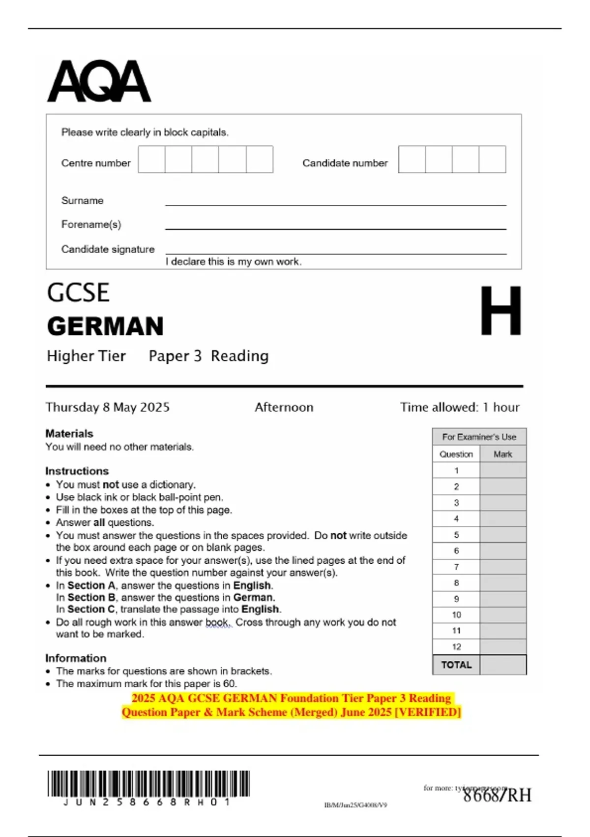 2025 AQA GCSE GERMAN Foundation Tier Paper 3 Reading