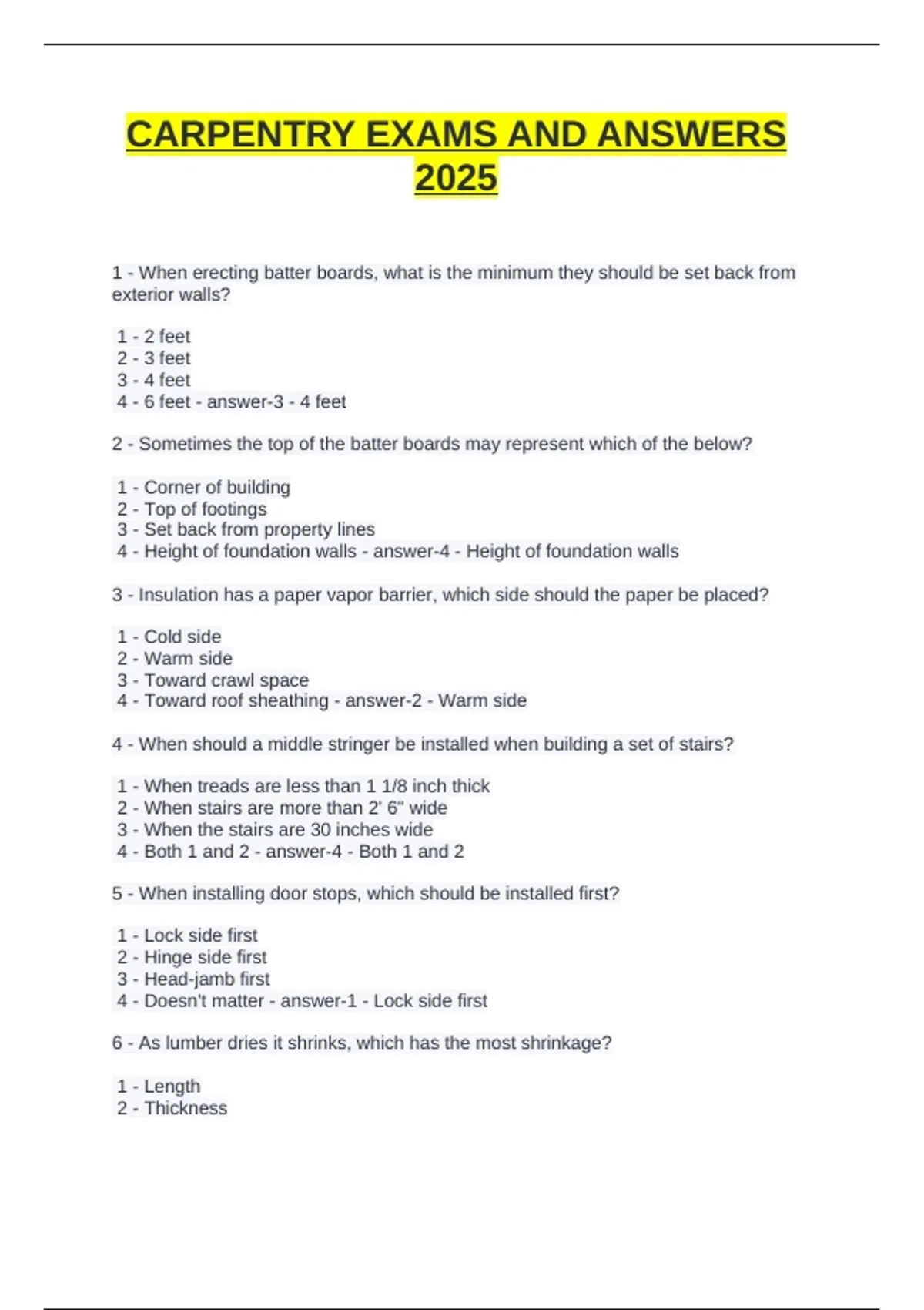 This document contains practice exam questions and correct answers for carpentry exams in 2025. It covers essential carpentry topics such as tool usage, measurements, framing, safety standards, materials, and construction techniques. The material is designed to support exam preparation and reinforce practical knowledge for carpentry certification or trade assessments.