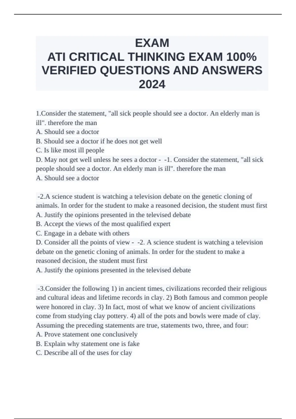 ATI Critical Thinking Exam – Practice Questions, Answer Rationales & Study Guide