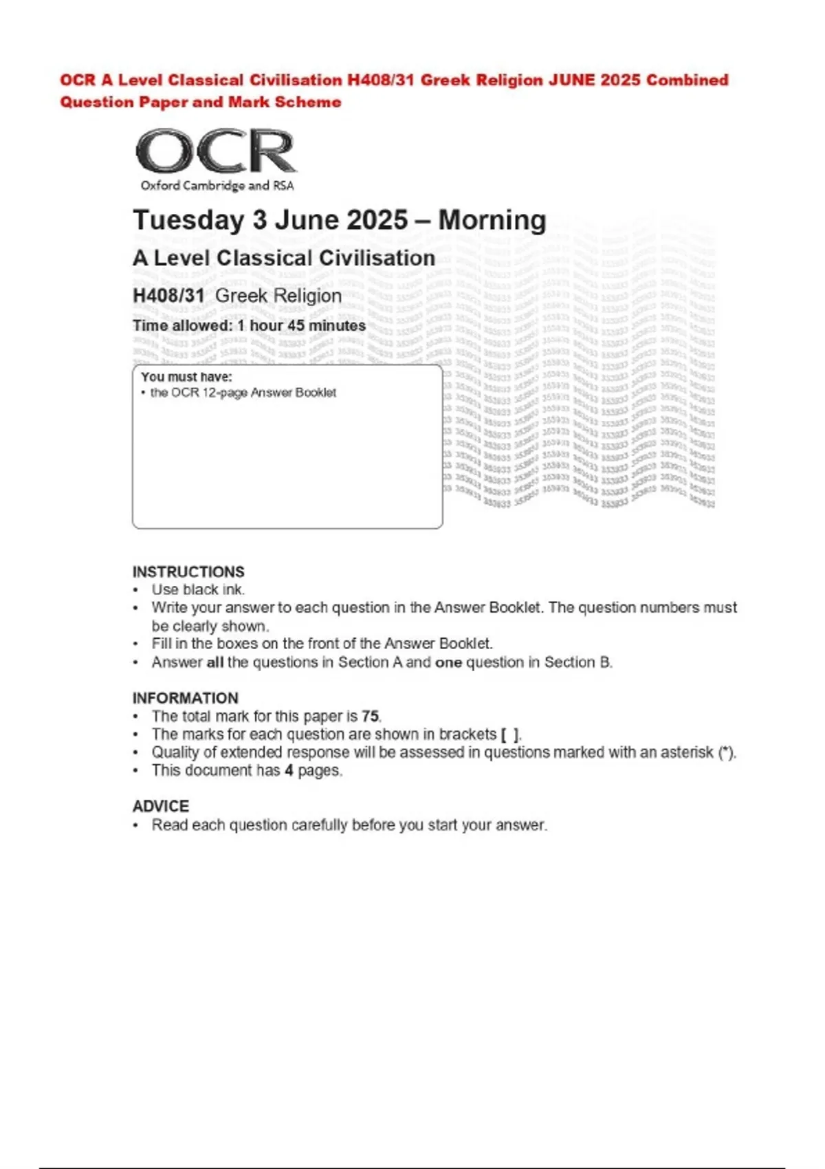 OCR A Level Classical Civilisation H408/31 Greek Religion JUNE 2025 Combined Question Paper and Mark Scheme