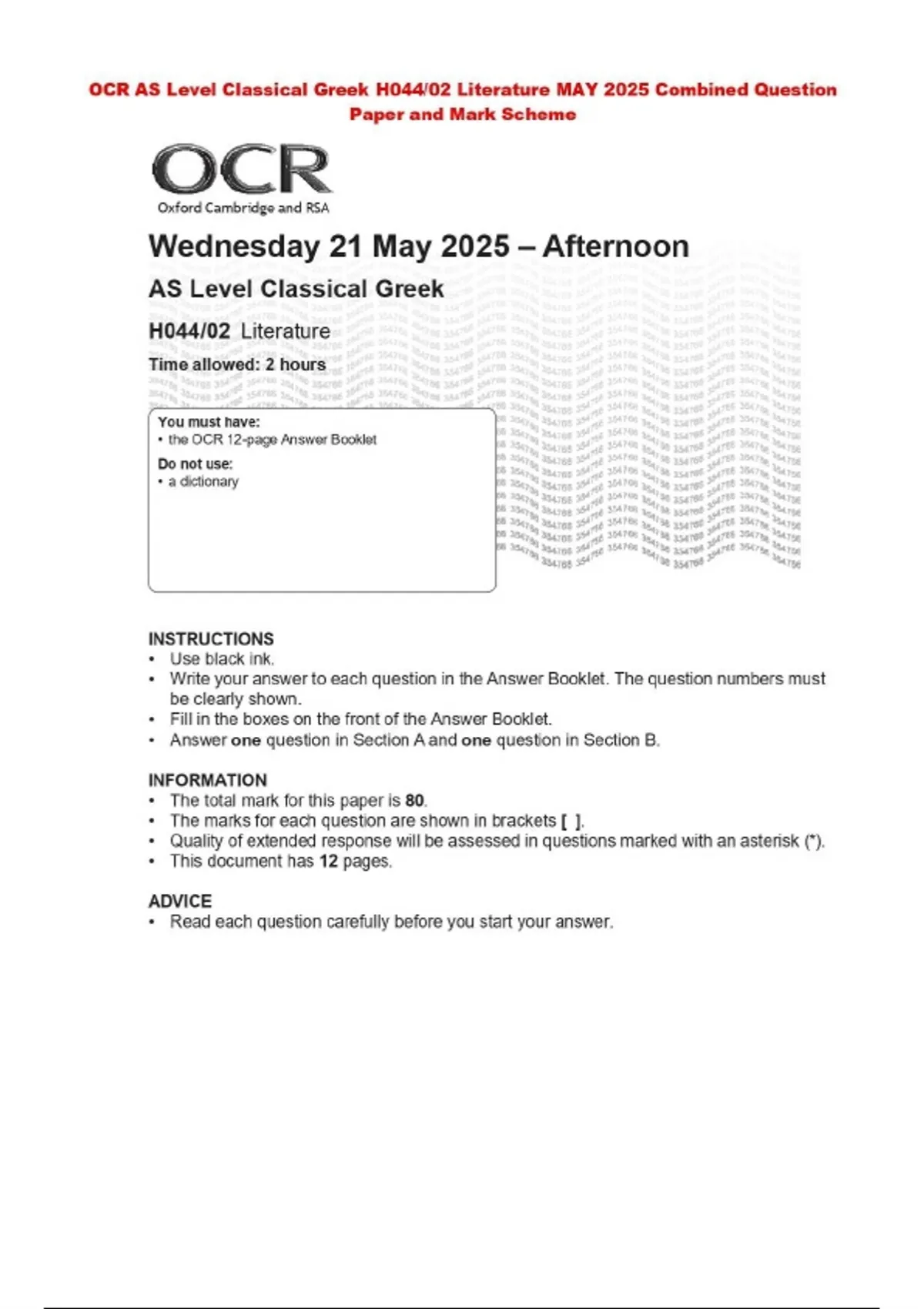 OCR AS Level Classical Greek H044/02 Literature MAY 2025 Combined Question Paper and Mark Scheme