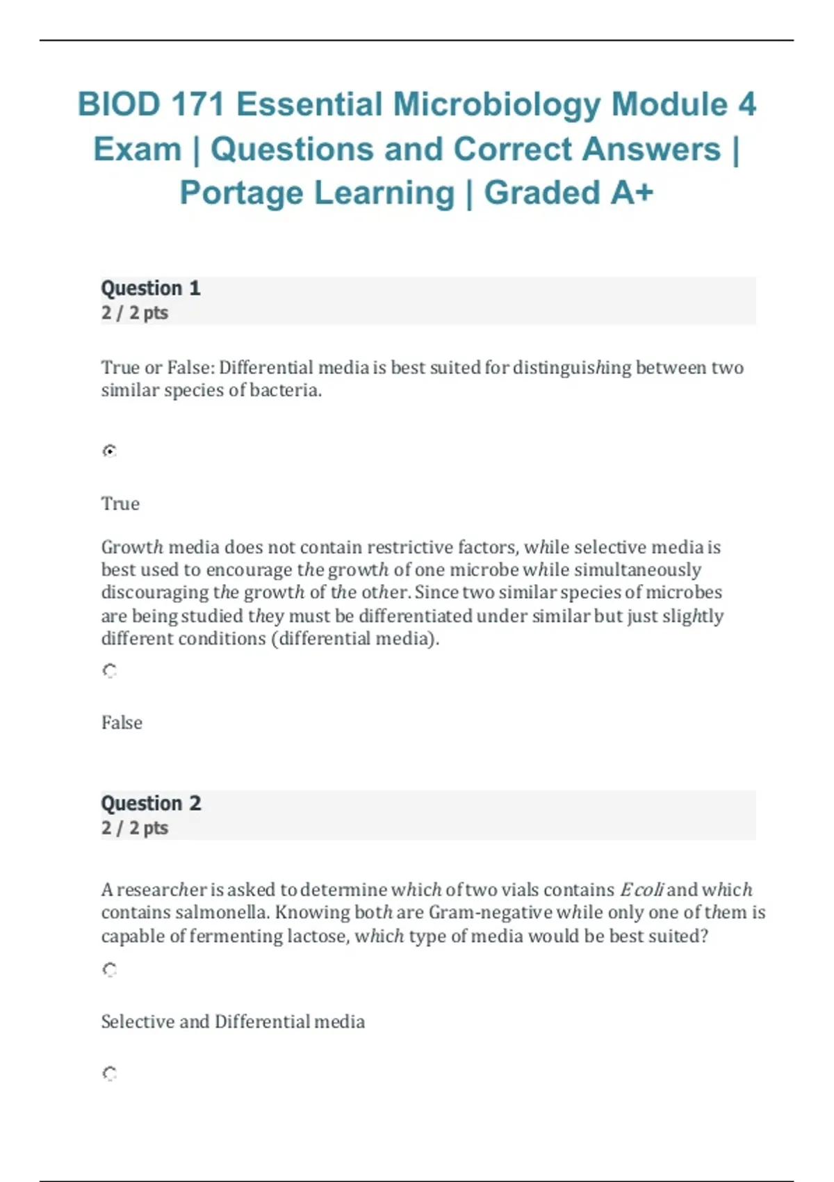 This document provides the BIOD 171 Essential Microbiology Module 4 exam questions with correct and verified answers for Portage Learning, updated for the 2026/2027 academic cycle. It covers key Module 4 topics with clear explanations to support understanding, reinforce core microbiology concepts, and improve exam readiness. The material is structured for efficient review and successful assessment performance