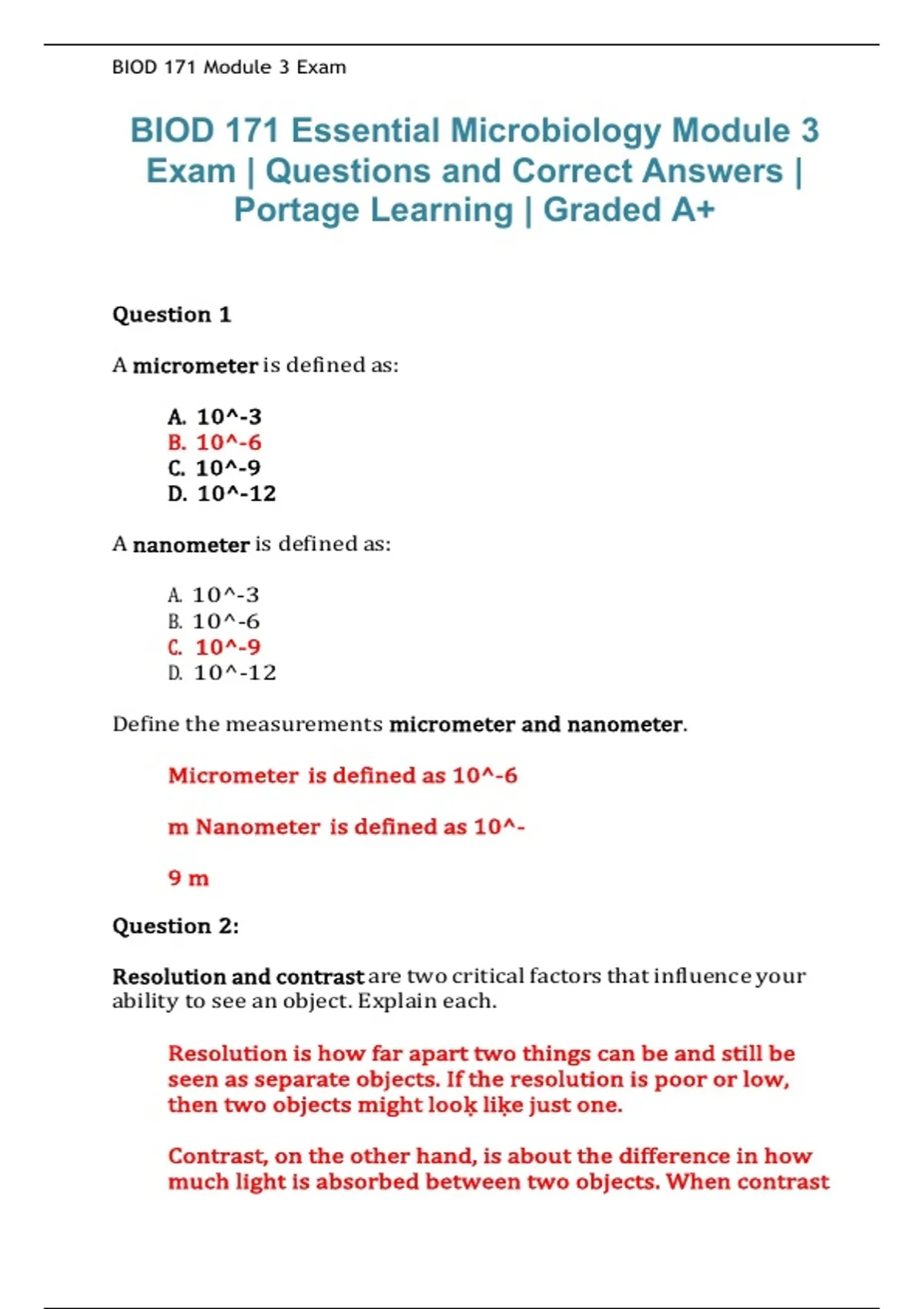 This document contains the BIOD 171 Essential Microbiology Module 3 exam questions with correct and verified answers for Portage Learning, updated for the 2026/2027 academic cycle. It covers all core concepts addressed in Module 3, with clear explanations to support comprehension, retention, and exam success. The material is structured for focused review and effective assessment preparation.