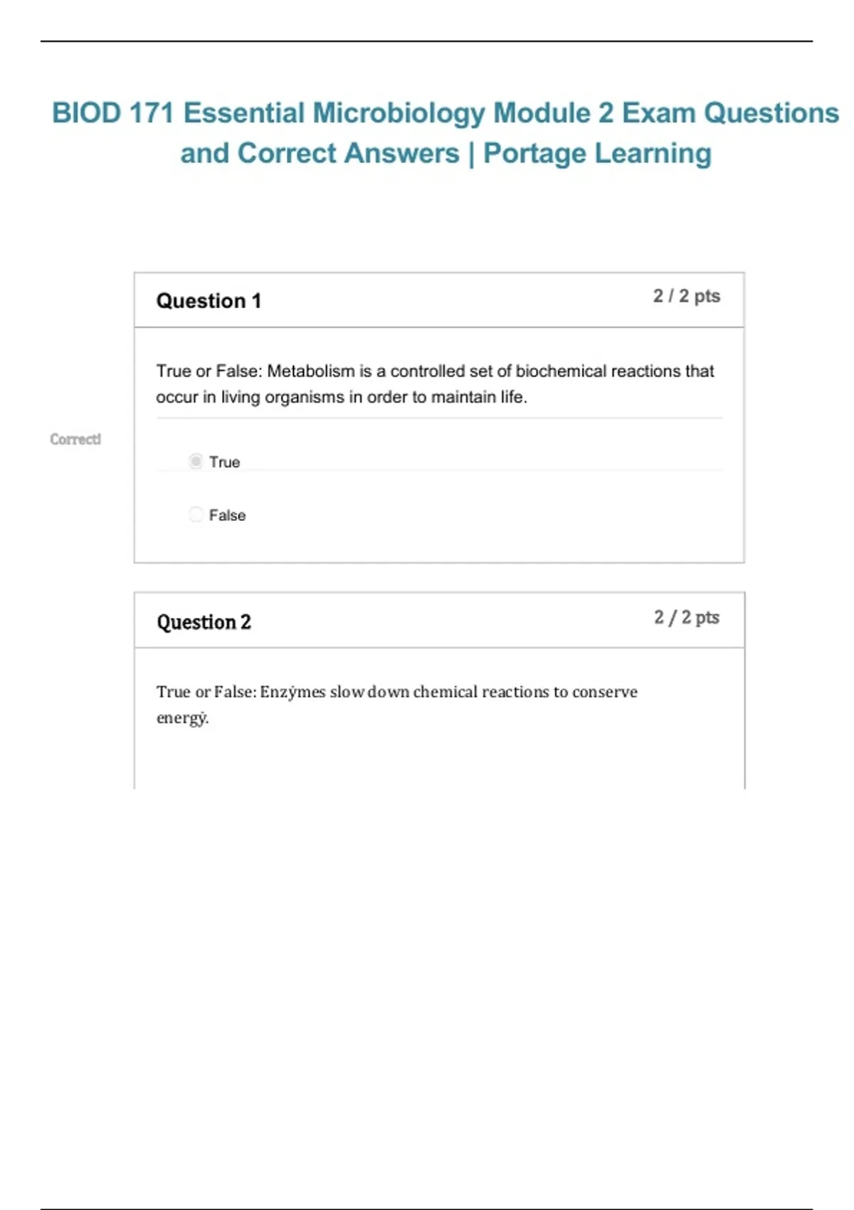 This document provides the BIOD 171 Essential Microbiology Module 2 exam questions with correct and verified answers for Portage Learning, updated for the 2026/2027 academic cycle. It covers key Module 2 topics with clear explanations to support understanding of foundational microbiology concepts and exam readiness. The material is structured for efficient review and accurate preparation.