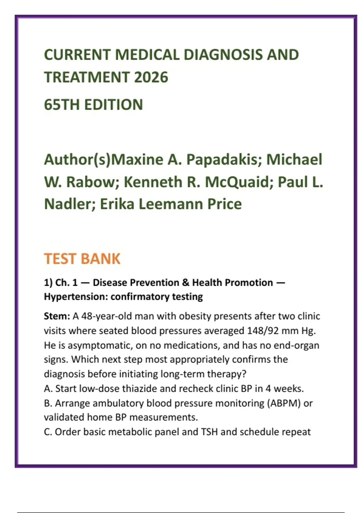 Rationale — Correct (B): CMDT summarizes current preventive