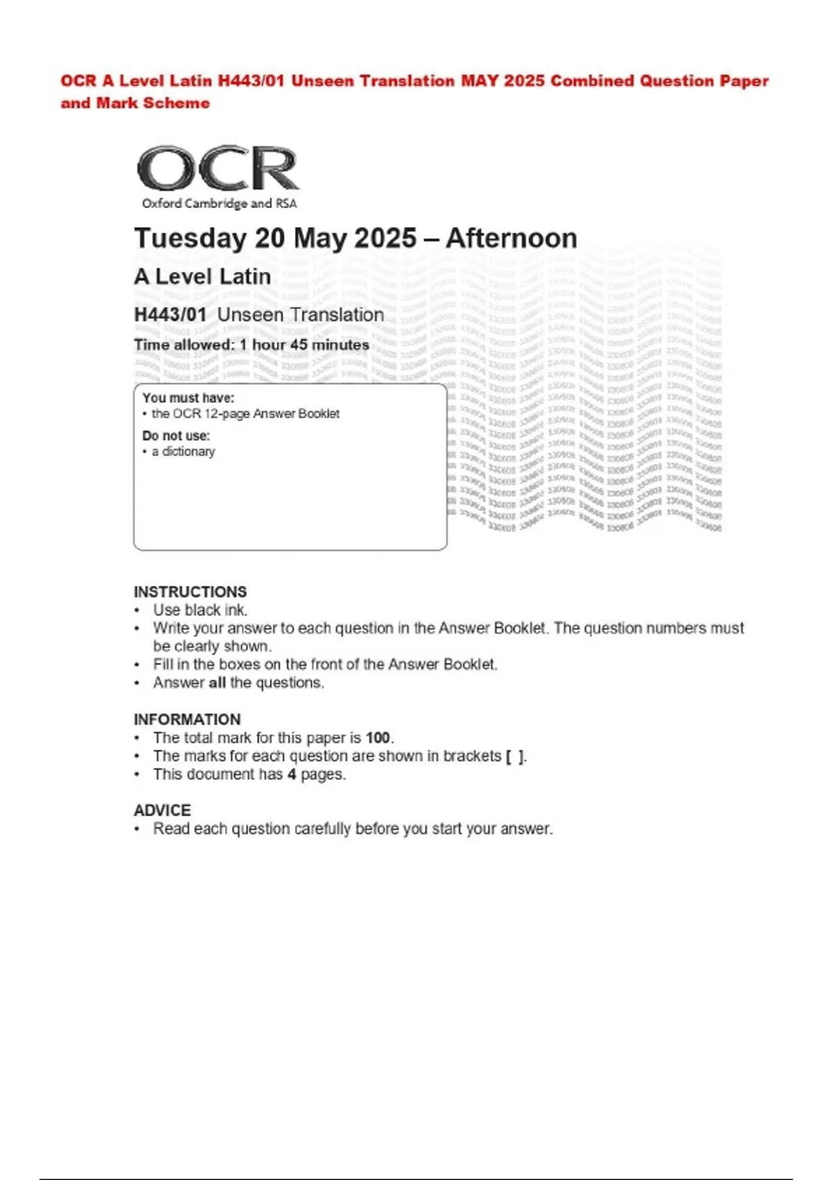 OCR A Level Latin H443/01 Unseen Translation MAY 2025 Combined Question Paper and Mark Scheme