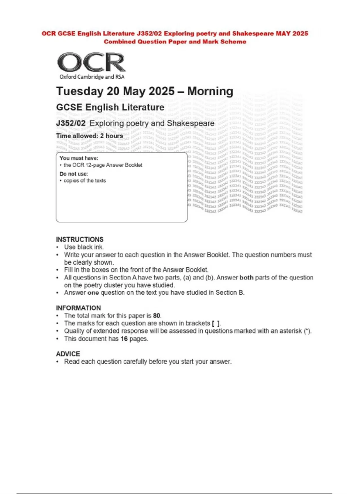 OCR GCSE English Literature J352/02 Exploring poetry and Shakespeare MAY 2025 Combined Question Paper and Mark Scheme