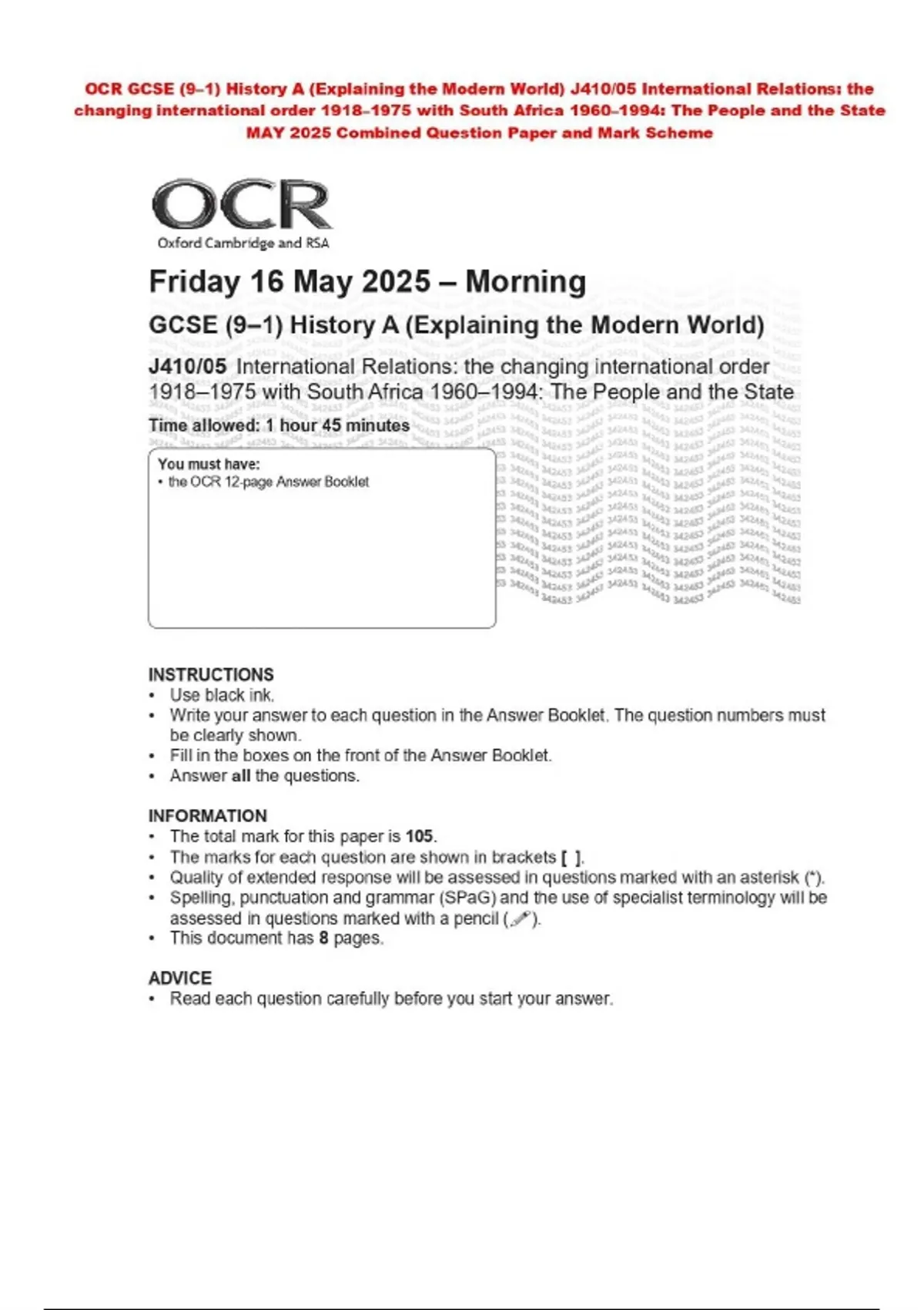 OCR GCSE (9–1) History A (Explaining the Modern World) J410/05 International Relations: the changing international order 1918–1975 with South Africa 1960–1994: The People and the State MAY 2025 Combined Question Paper and Mark Scheme