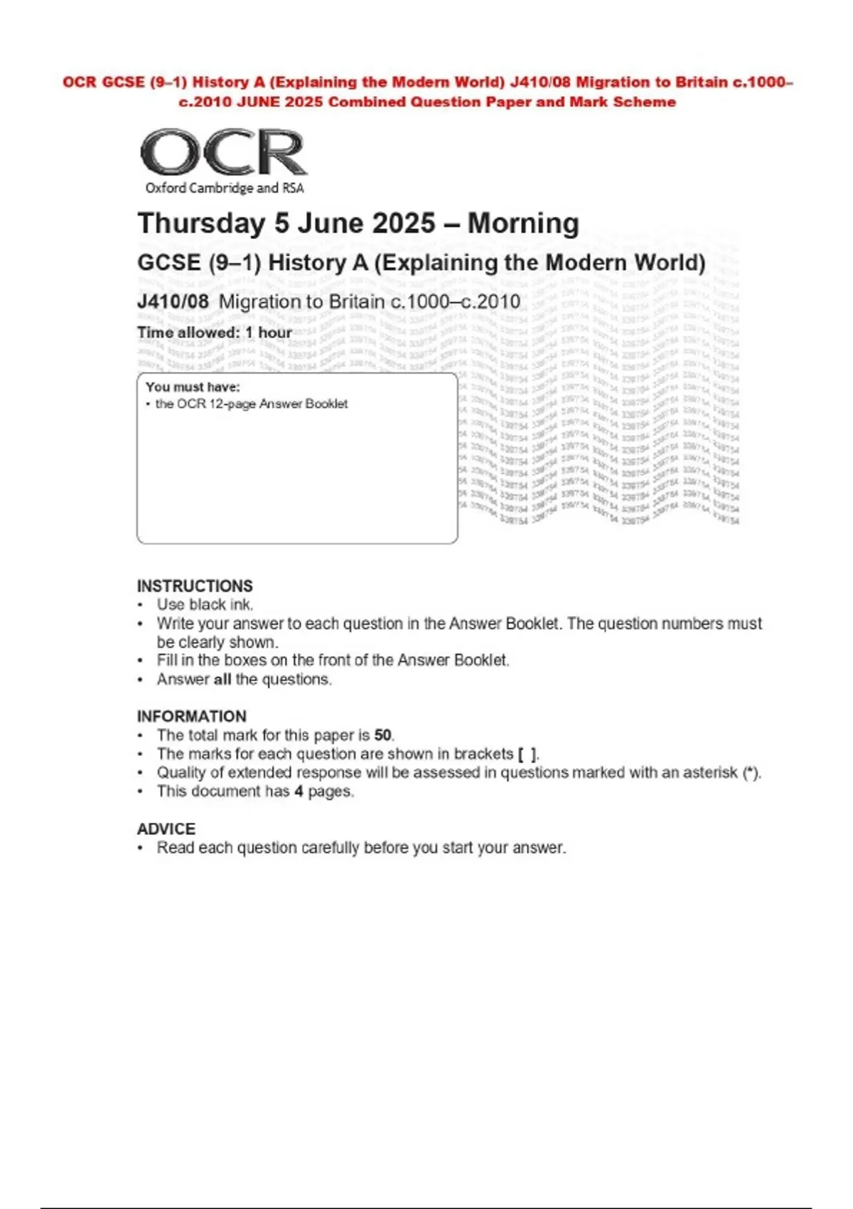 OCR GCSE (9–1) History A (Explaining the Modern World) J410/08 Migration to Britain c.1000 c.2010 JUNE 2025 Combined Question Paper and Mark Scheme