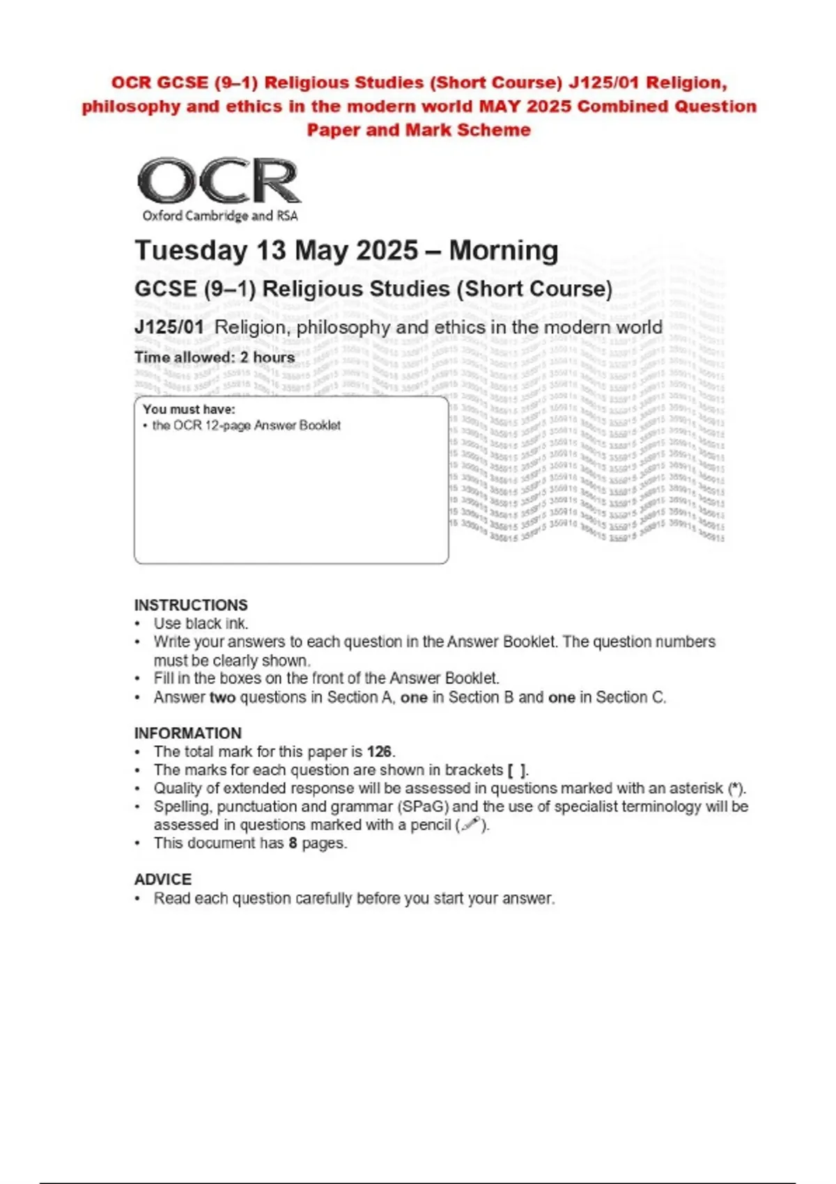 OCR GCSE (9–1) Religious Studies (Short Course) J125/01 Religion, philosophy and ethics in the modern world MAY 2025 Combined Question Paper and Mark Scheme
