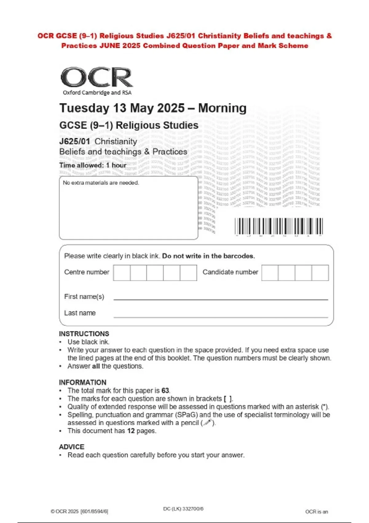 OCR GCSE (9–1) Religious Studies J625/01 Christianity Beliefs and teachings & Practices JUNE 2025 Combined Question Paper and Mark Scheme