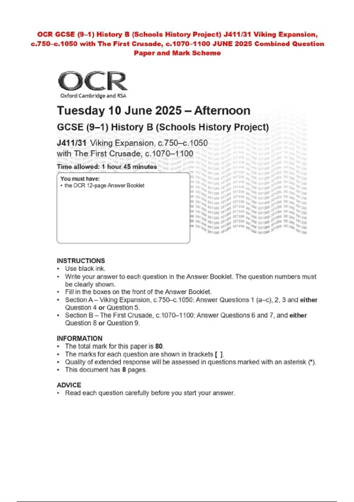 OCR GCSE (9–1) History B (Schools History Project) J411/31 Viking Expansion, c.750–c.1050 with The First Crusade, c.1070–1100 JUNE 2025 Combined Question Paper and Mark Scheme