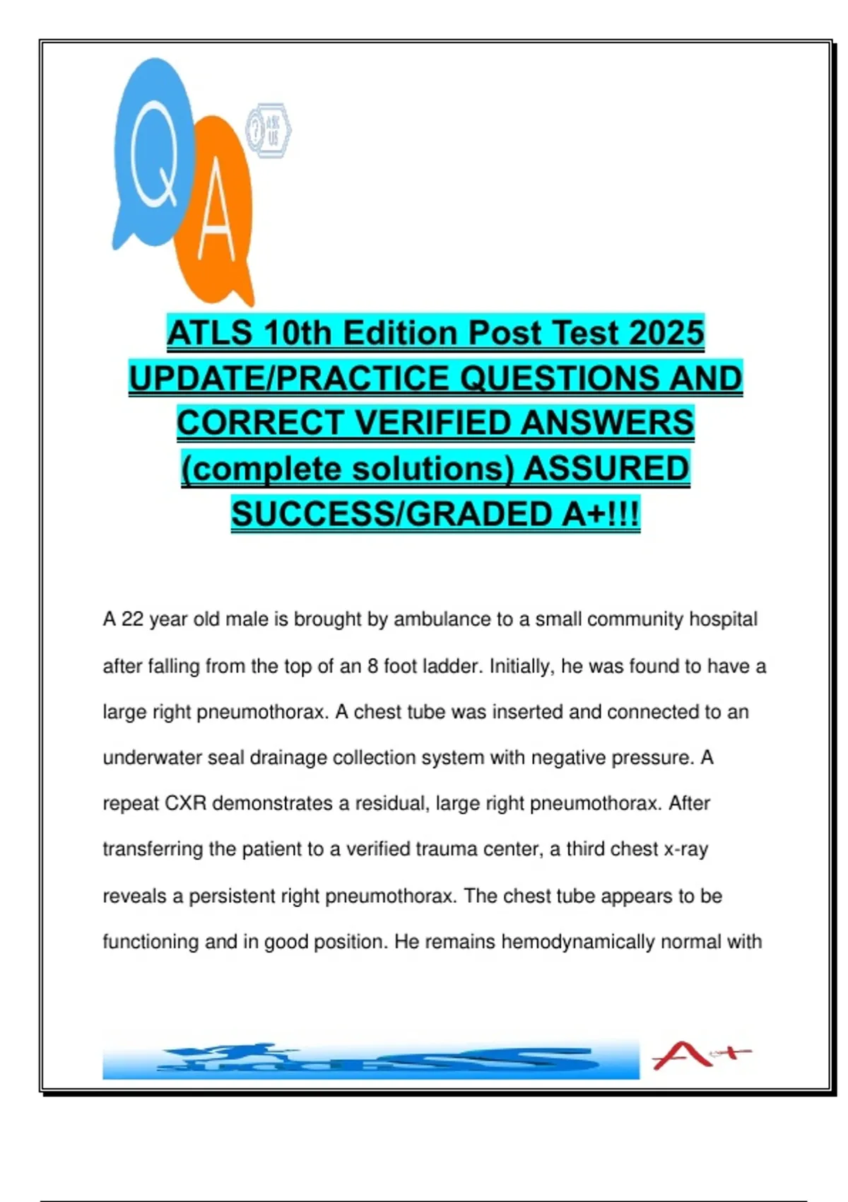 This document provides over 100 fully answered and verified ATLS post-test questions based on the 10th edition of the Advanced Trauma Life Support (ATLS) guidelines, updated for the 2025 academic year. It is designed to help students and professionals confidently prepare for ATLS exams and trauma-related clinical assessments, with high-yield explanations across major trauma care domains. Topics include the management of thoracic trauma, airway compromise, shock types (hemorrhagic, neurogenic, obstructive), neurological emergencies, burn injury protocols, spinal cord and orthopedic trauma, pregnancy and pediatric trauma, and diagnostic tools such as FAST, CT, DPL, and X-rays. Each question is accompanied by a clear and accurate answer to reinforce both clinical understanding and test-taking strategy. This document is highly beneficial for: Medical students studying emergency medicine, surgery, or preparing for trauma OSCEs Nursing students specializing in trauma or acute care Paramedics and EMTs needing ATLS-level knowledge for field and hospital scenarios Surgical and Emergency Medicine residents in trauma centers Healthcare professionals taking the ATLS provider or recertification exam Its extensive scope and direct alignment with the ATLS 10th Edition make it a complete and dependable study guide, ideal for both individual review and group preparation sessions. Keywords: ATLS, trauma questions, airway management, shock resuscitation, burns, neurotrauma, pregnancy trauma, pediatric trauma, FAST exam, hemodynamic instability, post-test questions, surgical emergency, spinal injury, hemorrhage, head injury, trauma MCQs
