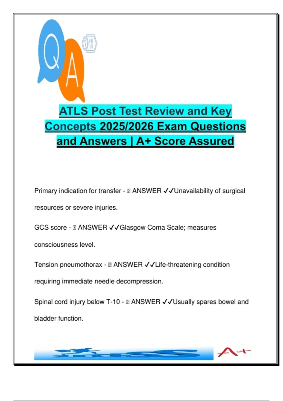 This document offers a comprehensive review of over 120 Advanced Trauma Life Support (ATLS) exam questions and key clinical concepts, based on the 10th Edition guidelines for the 2025/2026 academic year. It is structured as a high-yield Q&A resource that emphasizes both factual knowledge and clinical decision-making in trauma care, making it ideal for final-stage ATLS preparation or concept reinforcement. The document covers a wide range of core topics including primary and secondary surveys, airway management techniques (e.g. intubation, cricothyroidotomy, supraglottic devices), shock diagnosis and fluid resuscitation, neurotrauma and spinal cord injuries, thoracic trauma, burn injuries and escharotomy, pregnancy-related trauma considerations, and critical imaging and lab tests like FAST, DPL, CT, ABG, and serial troponins. Additional attention is given to triage protocols, hemodynamic instability, pediatric resuscitation, and special patient populations such as the elderly and pregnant. This resource is most relevant for: Medical students preparing for trauma or emergency exams Nursing students in emergency, surgical, or critical care training Paramedics and EMTs studying for ATLS-aligned trauma protocols Surgical and EM residents reviewing trauma fundamentals Healthcare providers pursuing ATLS certification or continuing education By blending exam-style questions with concise, clinically grounded answers, this document enables active recall and retention of essential trauma principles needed in both exam and real-life scenarios. Keywords: ATLS, trauma care, airway management, spinal trauma, neurotrauma, shock resuscitation, burns, FAST scan, pregnancy trauma, fluid therapy, hemorrhagic shock, Beck's triad, GCS, flail chest, DPL, trauma Q&A, emergency medicine, trauma exam review