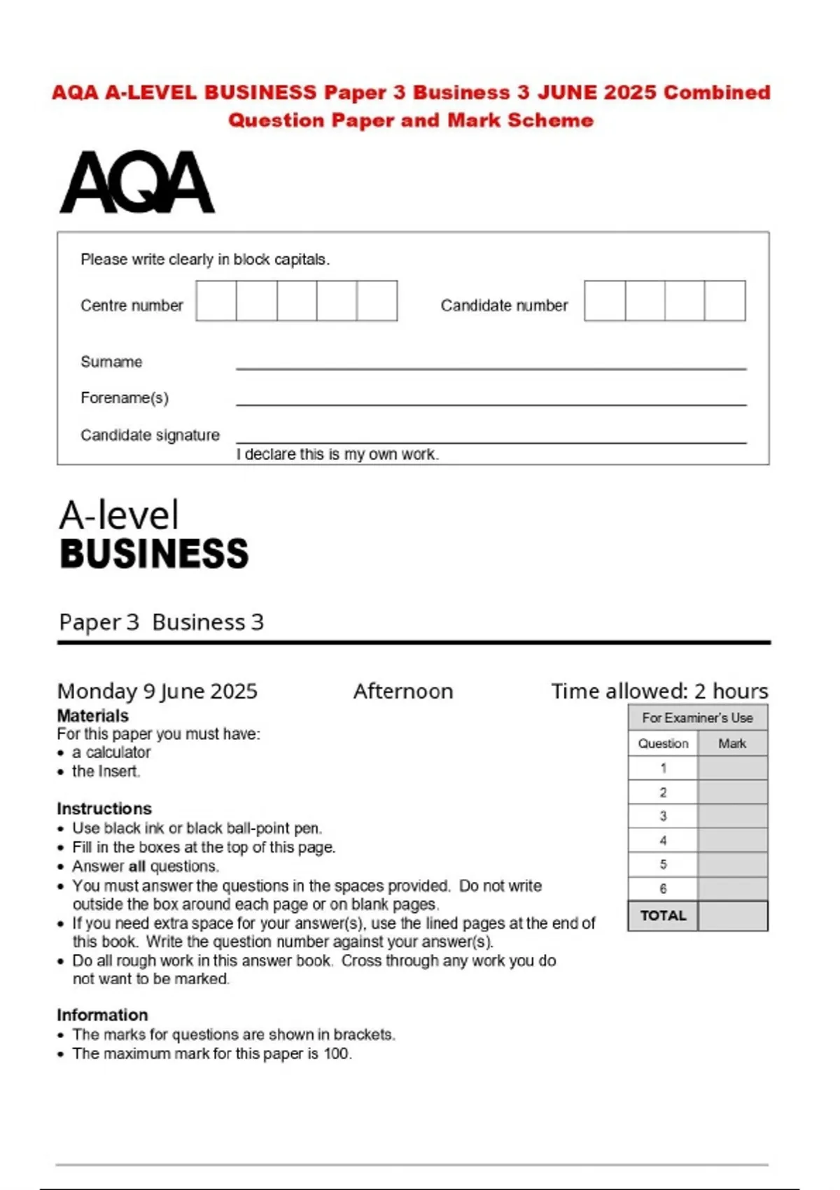 AQA A-LEVEL BUSINESS Paper 3 Business 3 JUNE 2025 Combined Question Paper and Mark Scheme