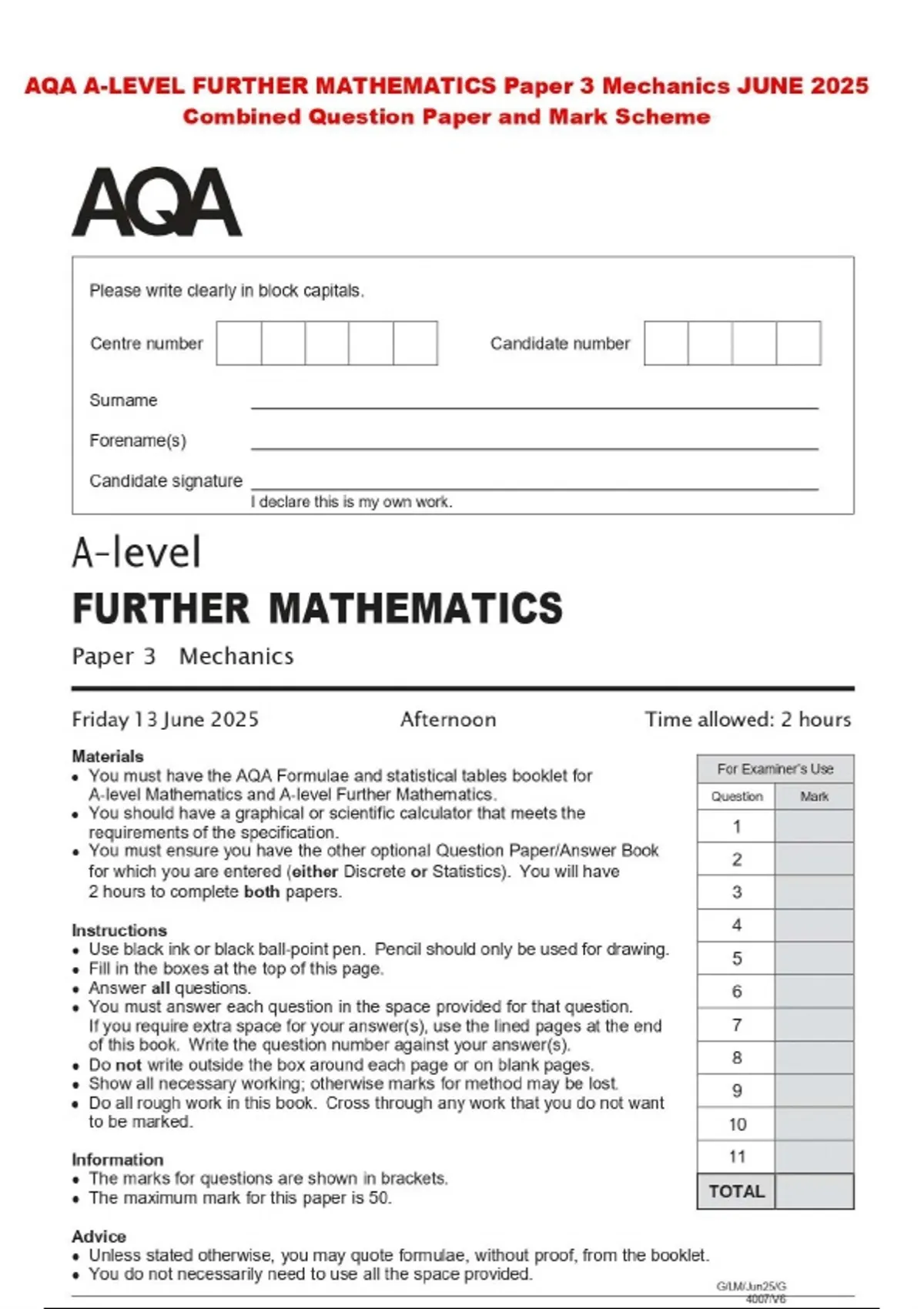 AQA A-LEVEL FURTHER MATHEMATICS Paper 3 Mechanics JUNE 2025 Combined Question Paper and Mark Scheme