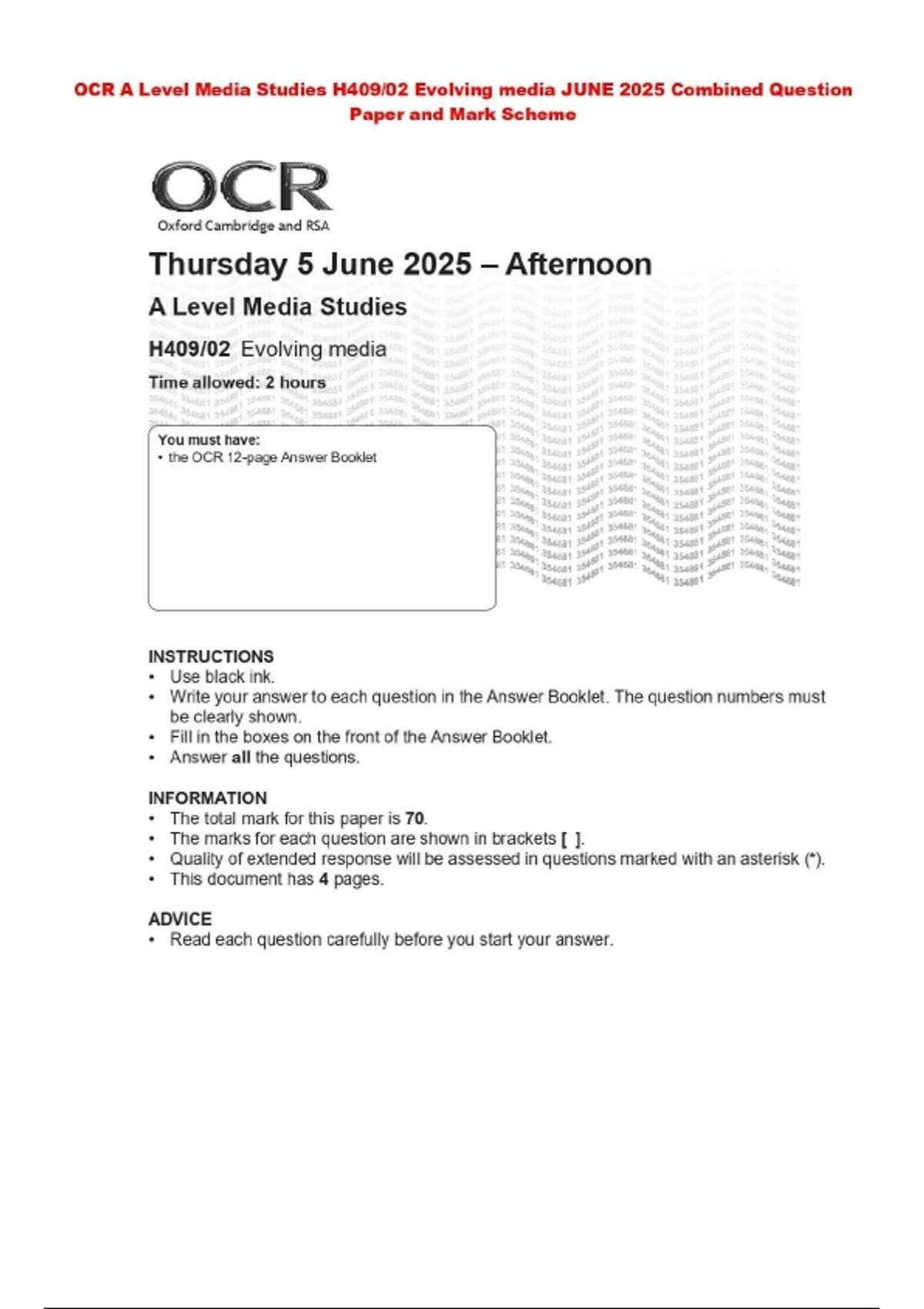 OCR A Level Media Studies H409/02 Evolving media JUNE 2025 Combined Question Paper and Mark Scheme
